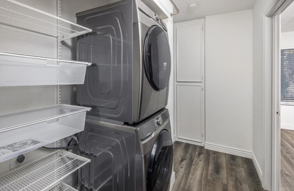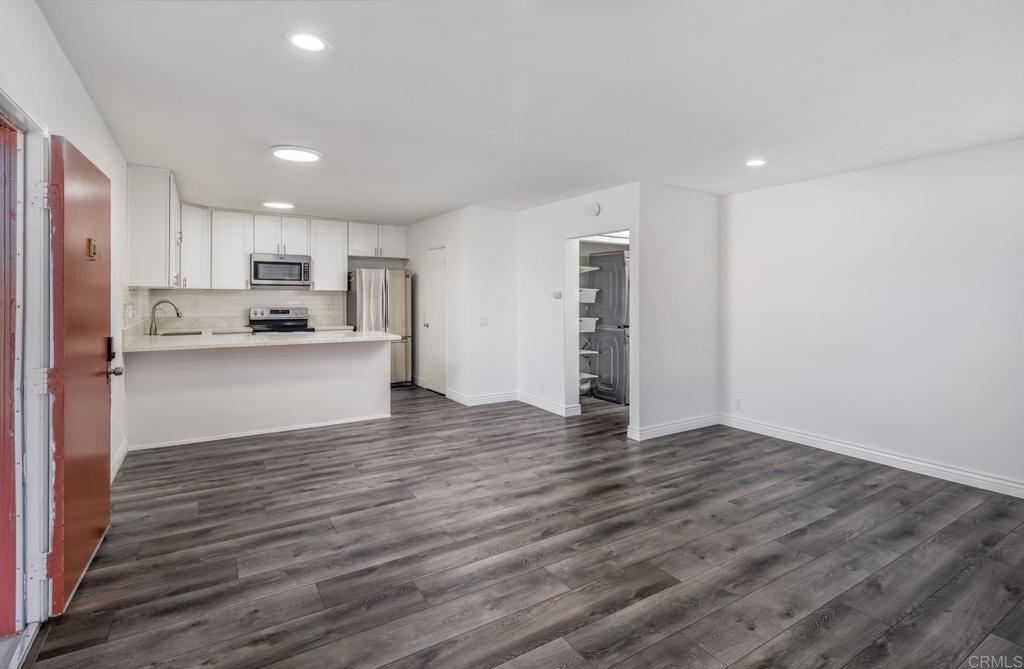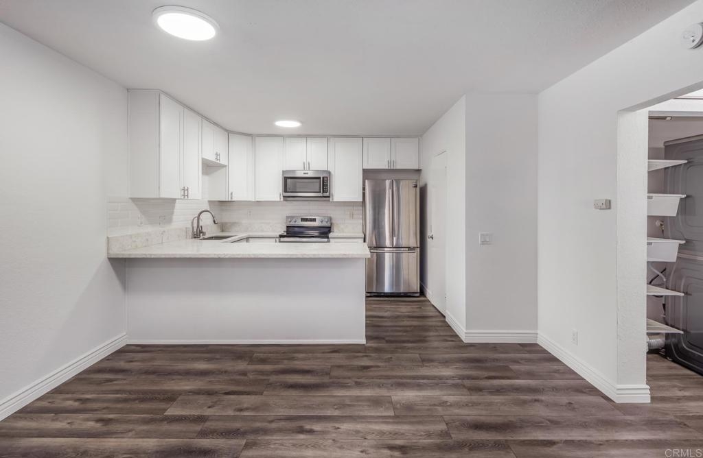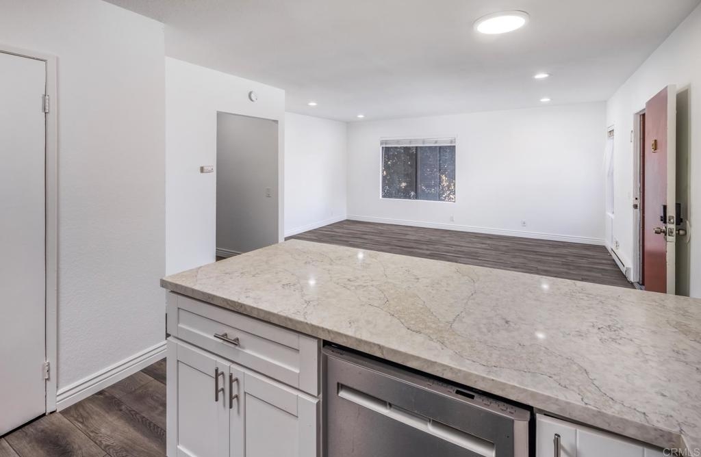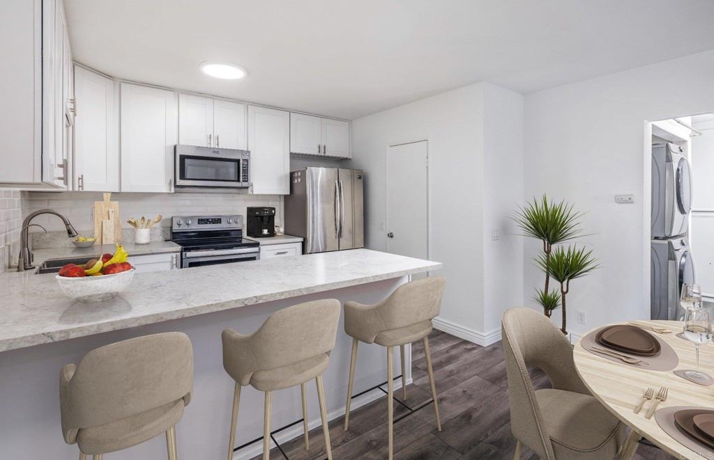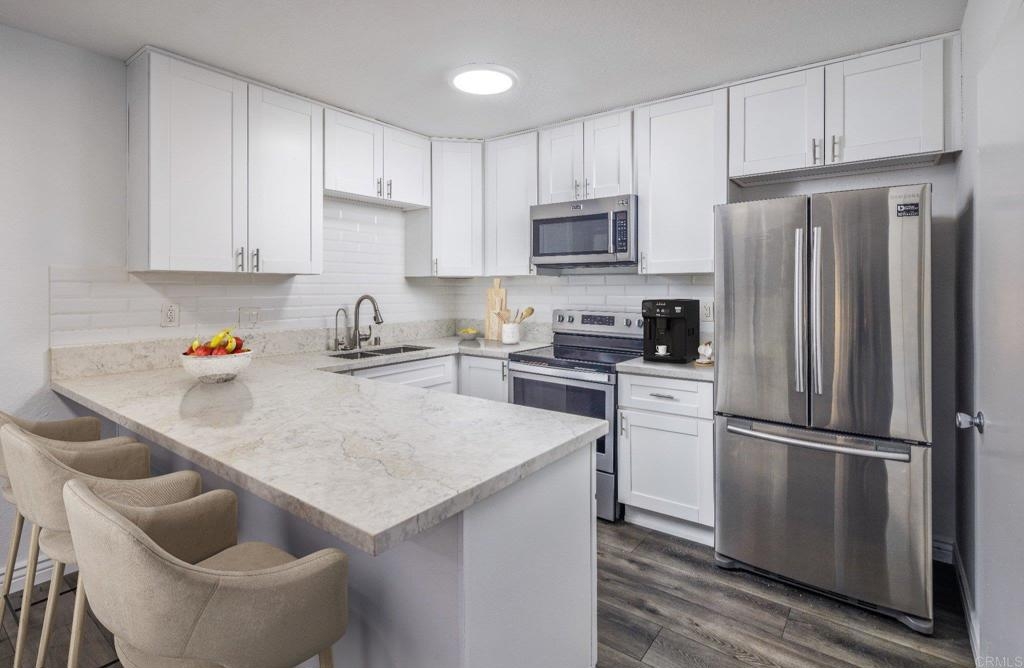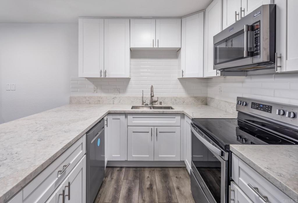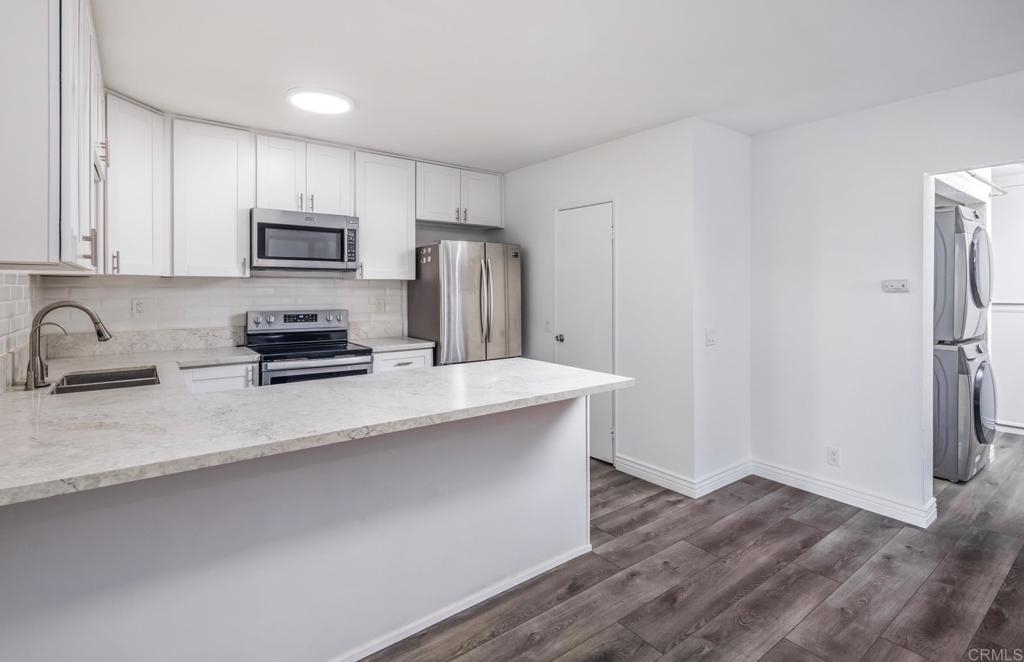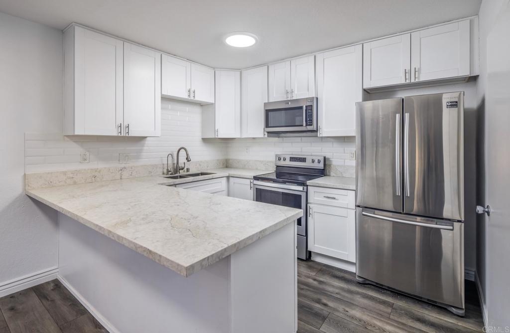 Welcome to this beautifully updated single-level, top-floor unit offering 3 bedrooms, 2 bathrooms, and 1,180 square feet of stylish living space. The open-concept layout features new LVP floors throughout, and a modern kitchen with stainless steel appliances, quartz countertops, subway tile backsplash, new shaker cabinetry, and a walk-in pantry—perfectly designed for everyday living and entertaining. Enjoy countertop seating and a dedicated dining area that flows seamlessly into the inviting family room with large windows that bring in lots of natural light. The primary suite offers a peaceful retreat with a large walk-in closet, en suite bath, and walk-in shower, while the secondary bedrooms have their own designated full bathroom with a tub/shower combo. Two of the bedrooms have access to a large balcony with a storage closet. Additional highlights include full-size in-unit washer and dryer, ample storage, fresh paint throughout the entire home, and two designated parking spaces. Ideally located just minutes from San Marcos Elementary, Cal State San Marcos, the library, shopping, dining, and easy freeway access—this home blends comfort, convenience, and modern style in one perfect package.