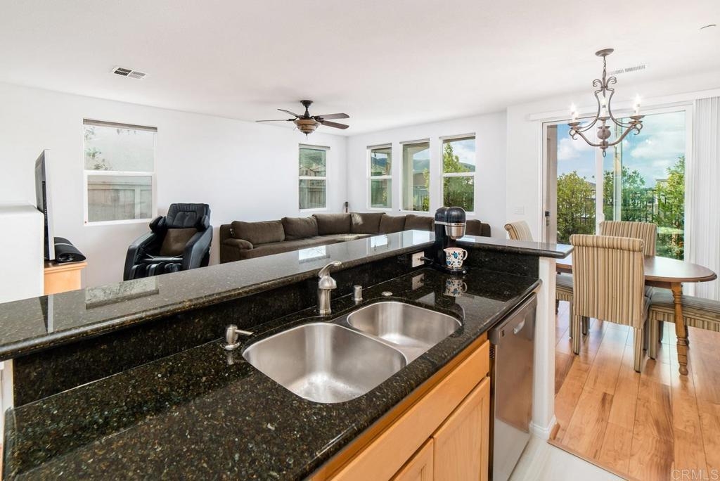 Amazing townhome in the gated community of Campana at Coronado Ranch. This open concept layout provides all the modern conveniences for everything you need to call home. The main level features stunning laminate plank wood floors throughout the living areas, a beautiful kitchen with granite counters and brand new tile floors, spacious family room which flows off the kitchen so you can entertain or watch the little ones while cooking, plus a dining area which leads to the back patio for easy indoor/outdoor access and a bonus room perfect for an office or study. Upstairs is the large master suite complete with an upgraded balcony showcasing views of the surrounding hills and gorgeous sunsets, as well as a large walk-in closet in the en-suite bath. Two additional bedrooms plus a full bath complete the floorplan. Additional features include: brand new carpet upstairs, brand new interior paint, low HOA, prime location close to CSUSM, walking distance to shopping centers and hiking trails, plus easy freeway access. Don't miss this opportunity!