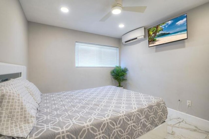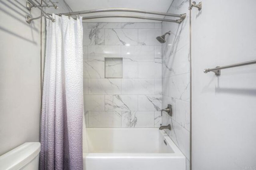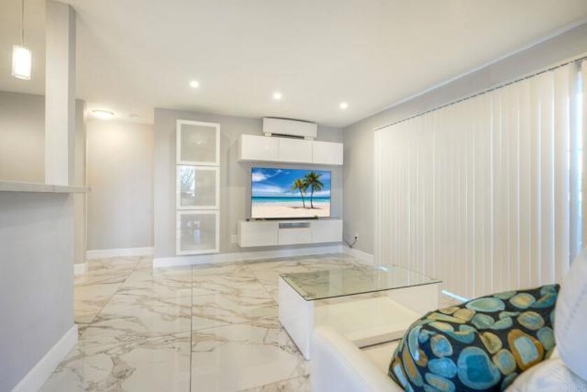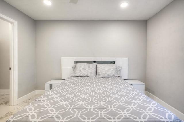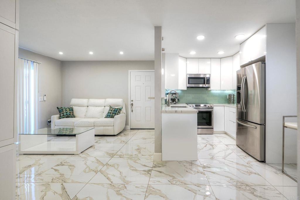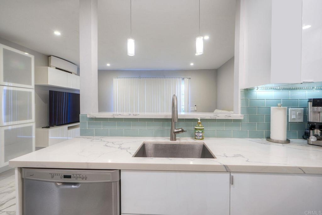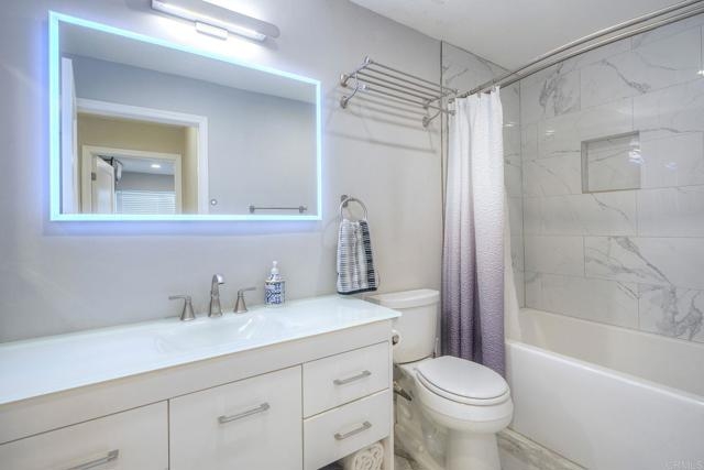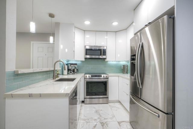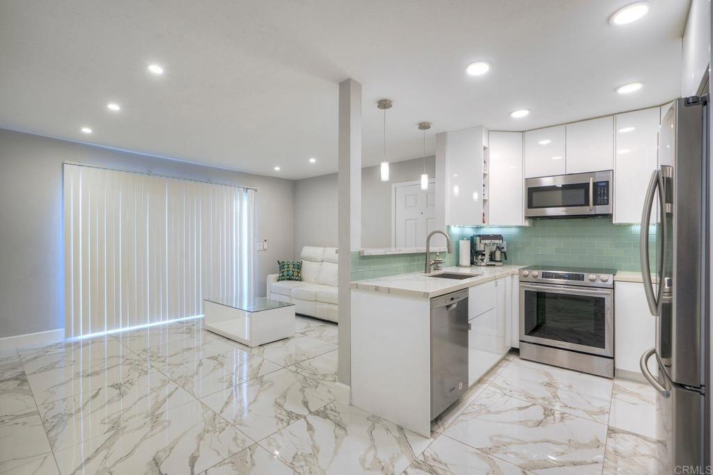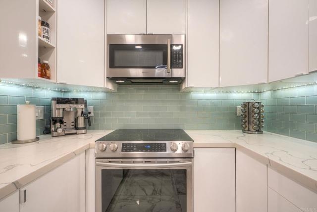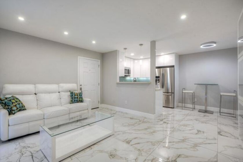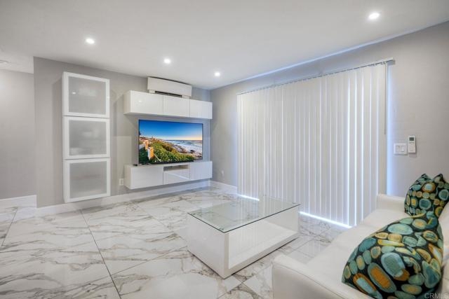 Every detail has been thoughtfully upgraded, making this immaculate unit truly stand out. The kitchen shines with sleek white cabinetry, striking aqua subway tile backsplash, quartz countertops, and modern stainless-steel appliances—including a dishwasher, stove, microwave, and refrigerator. Elegant marble-style porcelain tile flooring flows seamlessly throughout the home, and recessed lighting on dimmers with app-control, creating a clean and sophisticated look. Milgard dual-pane windows for the screen door and the bedroom window for extra comfort and noise reduction. The open living room offers built-in floating cabinets, and offers a Split System Cooling and Heating System—making it both functional and inviting. The bedroom features its own split system cooling/heating system as well and ceiling fan, a spacious closet with upgraded chrome rod and shelving. The bathroom has been completely and beautifully remodeled with marble-style porcelain tile, a chic vanity, and a lighted LED mirror that brings spa-like ambiance. This turnkey condo combines modern upgrades, comfort, and convenience all in one—an exceptional opportunity you won’t want to miss! This unit is located just minutes to state distinguished schools in San Marcos, University Cal State San Marcos, Palomar College, and the new Medical Hub in San Marcos/North County. Unit is located on the first floor with easy access and includes one parking space located at Space #28 available to use for viewings. Appliances included are Refrigerator, Dishwasher, Stove, Microwave and 2 Split Cooling/ Heating Systems, App-controlled lighting system. Great investment for a rental, the seller rented the property through VRBO, with summertime income ranging from $4,000 to $5,000 per month, and winter income around $2,500.