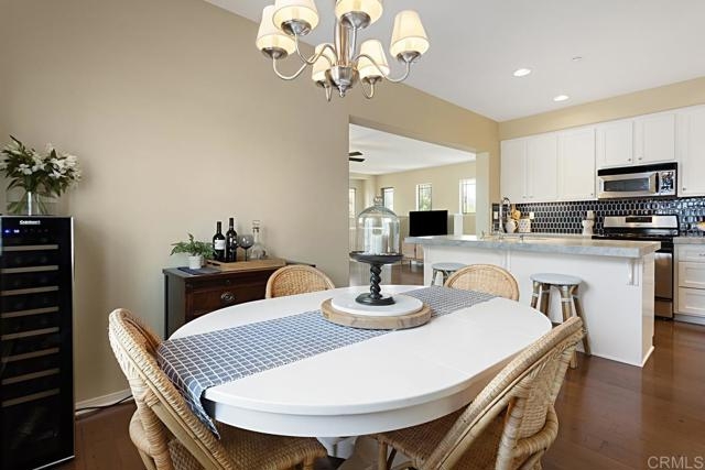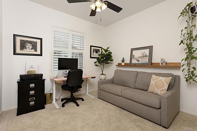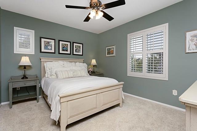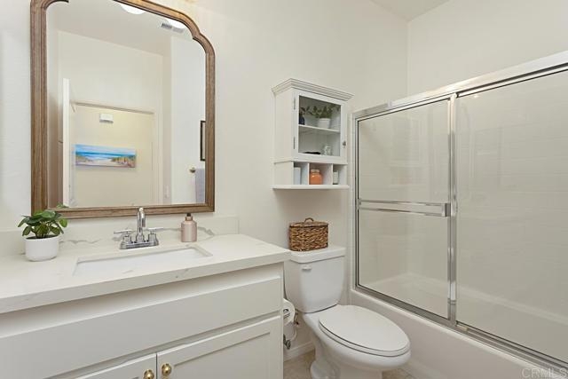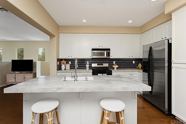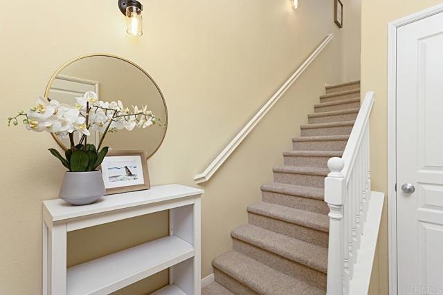 MOVE IN READY and SO LOVED!! Immaculate, END UNIT, open-concept townhome featuring 2 bedrooms, 2 full baths with attached 2 car garage! Perfect fit for first time home buyer, investment (walking distance to St. Augustine, minutes to CSUSM and Palomar College) or right sizing. Beautifully appointed with real wood flooring, Plantation Shutters, and many updates. Spacious family room is adorned with wainscoting and an abundance of windows to enjoy greenery and open feel. Spacious, remodeled kitchen featuring Leathered Quartzite countertops and island, full tile backsplash, Shaker Cabinetry, Stainless steel appliances, farmhouse sink, recessed and under cabinet lighting. Relax and unwind on your private Balcony which offers southwesterly breezes and sunsets with views of mature trees and hills. Primary Suite is spacious with gorgeous bathroom and walk-in mirrored closet. Secondary bedroom features mirrored closet doors and is located across from a beautifully updated bathroom. Laundry is in the unit near bedrooms! New A/C (2022) and ceiling fans in the living room and both bedrooms. Carriage Walk Community is located in a prime location and offers ample guest parking, tot lot and walking trails maintained by the City of San Marcos. Close to freeways, shopping, parks, top rated schools and Twin Oaks Golf Course. A must see!