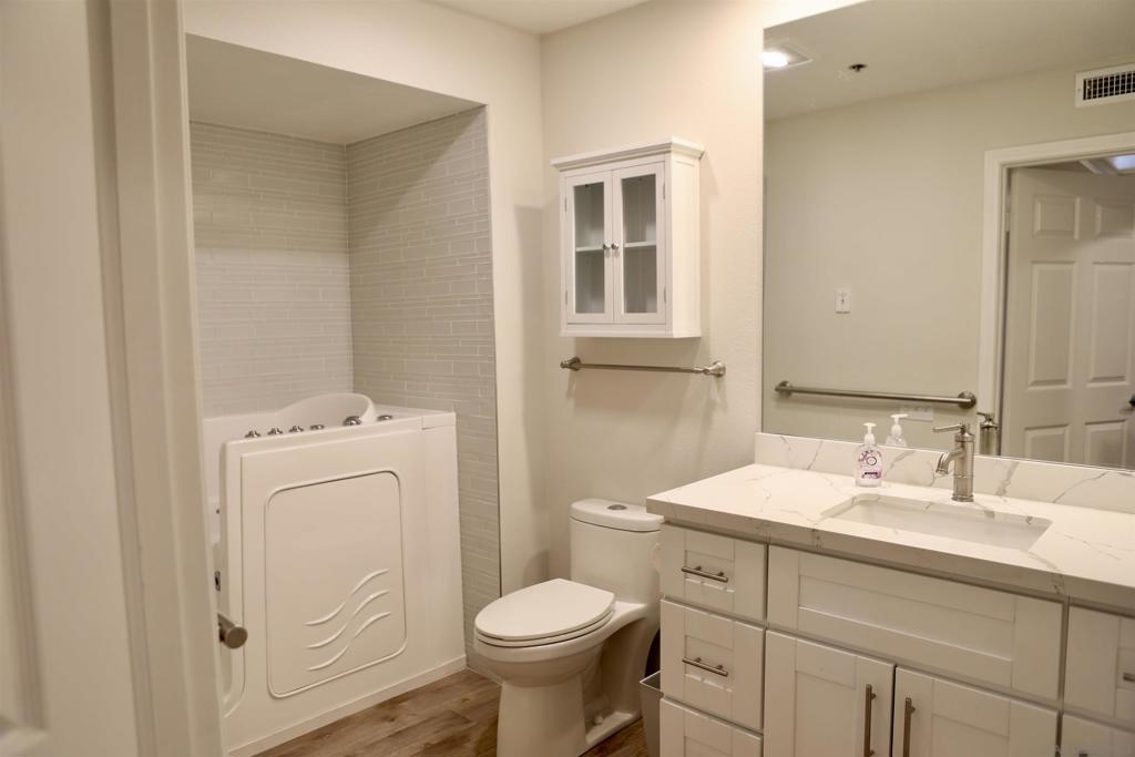 Welcome to Chateau Lake San Marcos, a premier 55+ independent living community offering a lifestyle of luxury and convenience. This beautifully remodeled first-floor unit has been meticulously upgraded, featuring a spacious expanded kitchen with a desk area, a cozy stone living room fireplace, and new vinyl flooring throughout. The bedroom boasts plush carpeting and custom walk-in closet built-ins, ensuring both comfort and organization. The upgraded bath features shaker style cabinets and a luxurious walk-in jetted tub. The Chateau provides a resort-style living experience with a large lap pool and spa, a fitness center, a library, game rooms, lounges, and a care center. Residents can enjoy a host of amenities, including a dining plan with 28+ gourmet meals per month available in the restaurant dining room or via room service. Bi-weekly housekeeping with linen services, in-home emergency on-call systems, and hotel-style concierge services add to the convenience. Engage in a variety of activities, clubs, and local transportation services for shopping trips and medical appointments, all included in the HOA fee. Additionally, your HOA covers gas, water, sewer, trash, basic cable, and internet. Residents also have exclusive access to Lake San Marcos amenities, including a recreation lodge, tennis and paddle tennis courts, and two additional swimming pools. The Lake San Marcos community also boasts a championship golf course and an 18-hole public executive course. Experience the ultimate in luxurious independent retirement living!