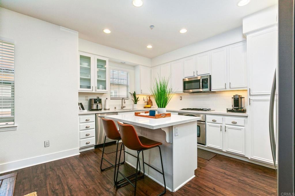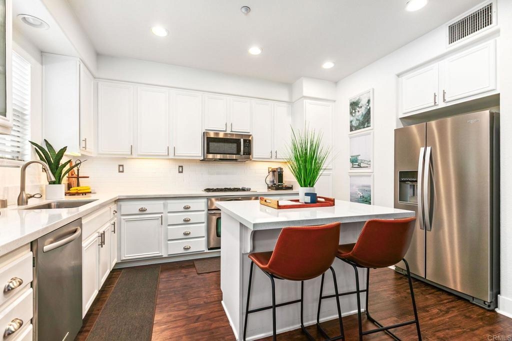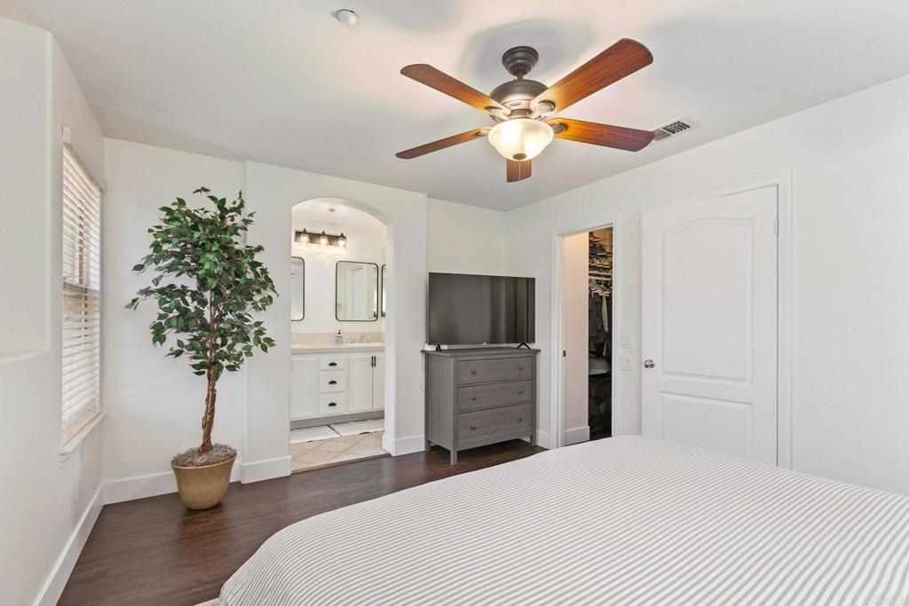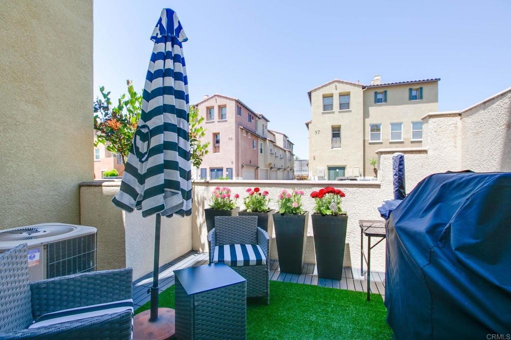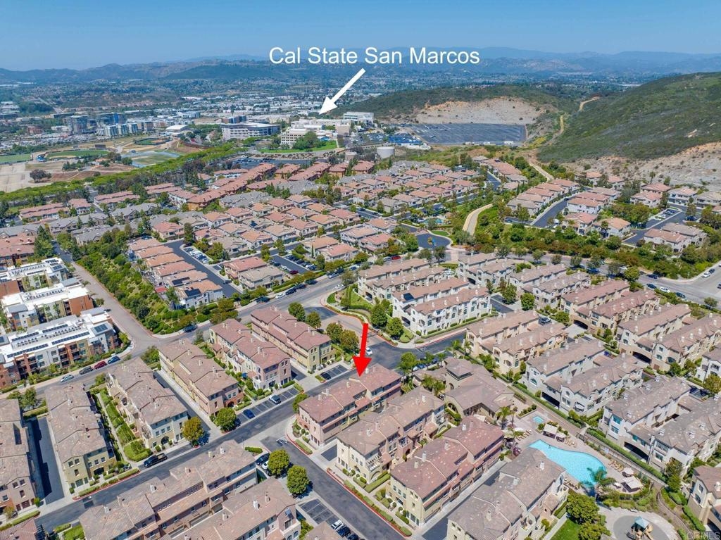 Located just one mile from Cal State San Marcos, this beautifully remodeled tri-level townhome offers the perfect blend of convenience, comfort, and value. With low Mello-Roos and HOA fees, it’s an excellent opportunity for both homeowners and investors alike. The home features three bedrooms and two and a half bathrooms, including a spacious primary suite with an ensuite bathroom. The versatile entry-level room functions perfectly as a third bedroom, office, or additional living space and opens to a private patio. The open-concept main floor includes a modern kitchen, living area, laundry, and a convenient half bath, creating a layout ideal for everyday living and entertaining. Interior upgrades include quartz countertops, updated cabinetry, newer stainless steel appliances, and an in-unit washer and dryer. Luxury vinyl plank flooring runs throughout the home, complemented by modern baseboards and a freshly painted interior in neutral tones. A gas fireplace with a quartz surround adds a touch of warmth and elegance. The attached two-car garage features epoxy flooring and a new garage door opener, while the private patio offers a great space for seating and barbecuing. The home is just steps away from a wide array of community amenities, including a pool, hot tub, gym, BBQ area, tot lot, dog park, and more—all within a gated and guarded community. This prime location offers easy access to CSUSM, medical centers, shopping, restaurants, and major freeways. Whether you're seeking a move-in-ready residence or a high-potential rental, this townhome delivers on all fronts and is VA approved.