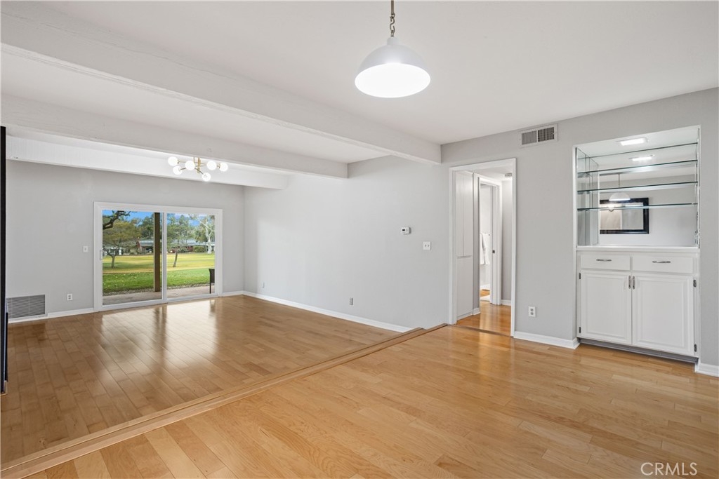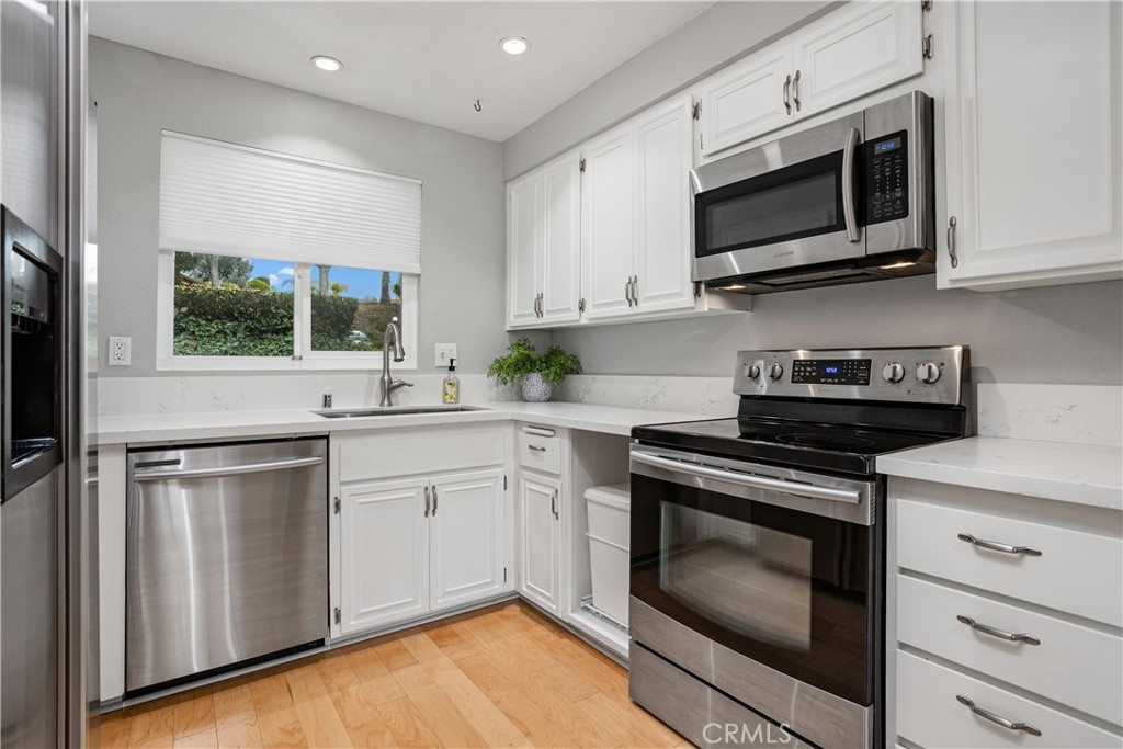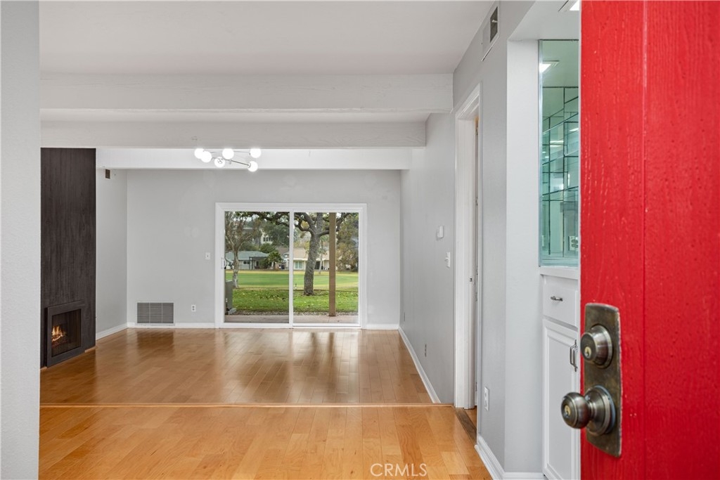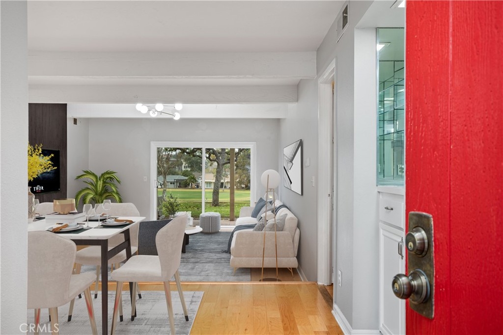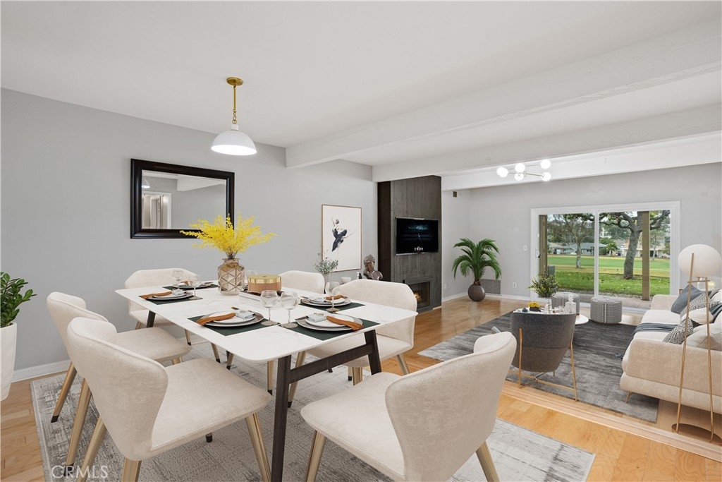 You’ve found it—your very own beautiful corner of paradise on the 10th fairway of a lush golf course, offering both sunrise and sunset views! This 2-bedroom, 2-bathroom, golf course-level condominium features 1,150 square feet of modern style, boasting a well-appointed kitchen with quartz countertops, stainless steel appliances, recessed lighting, a large modern sink, and a cabinet pantry. Immediately adjacent to the kitchen is the open-concept dining area and family room, both adorned with gorgeous wood floors. Across from the dining area is a bar, perfect for mixing cocktails for you and your guests to enjoy while taking in the panoramic views of the mountains and golf course from your private, spacious, covered back patio. The ample family room features a dramatic, newly painted gas fireplace that stretches from floor to ceiling. The primary bedroom offers stunning golf course views, wall-length mirrored closet doors, and brand-new carpet. The secondary bedroom also includes mirrored closet doors and new carpeting. This beauty also includes its own laundry area with an included washer and dryer, along with a covered carport offering ample storage. This home boasts an amazing array of amenities both inside and out! Community amenities include a large pool, spa, tennis and pickleball court, and a gorgeous clubhouse, just a short walk from your patio. Even more impressive, the association covers a dizzying array of paid amenities, including cable TV, internet, water, and trash. Only a short distance from Lake San Marcos, award-winning San Marcos schools, amazing restaurants, abundant shopping, and a short drive to Carlsbad Beach and outlets, this golf course hideaway won’t last!