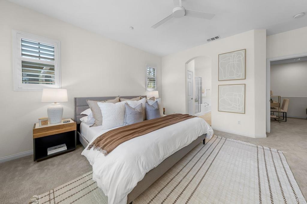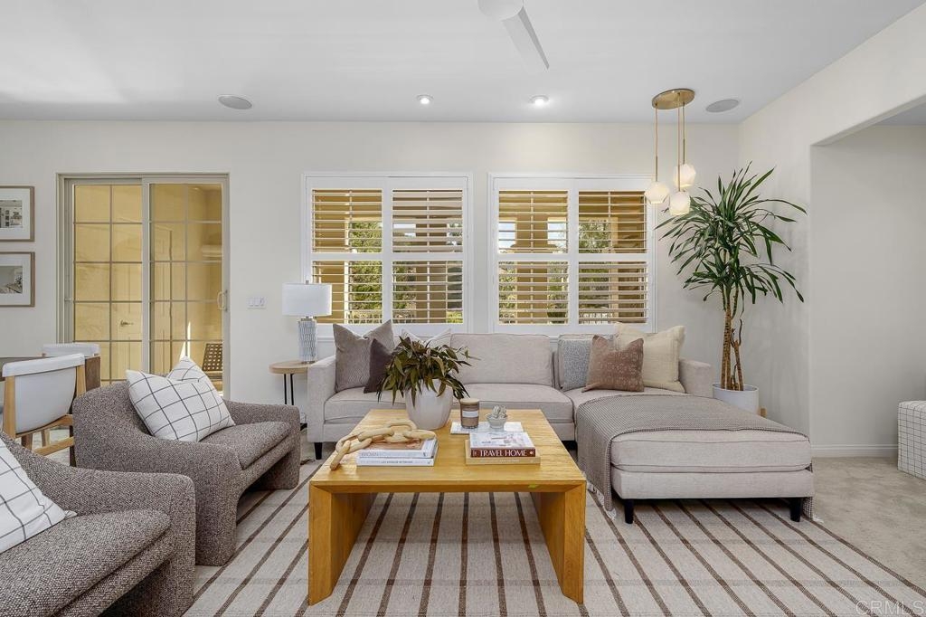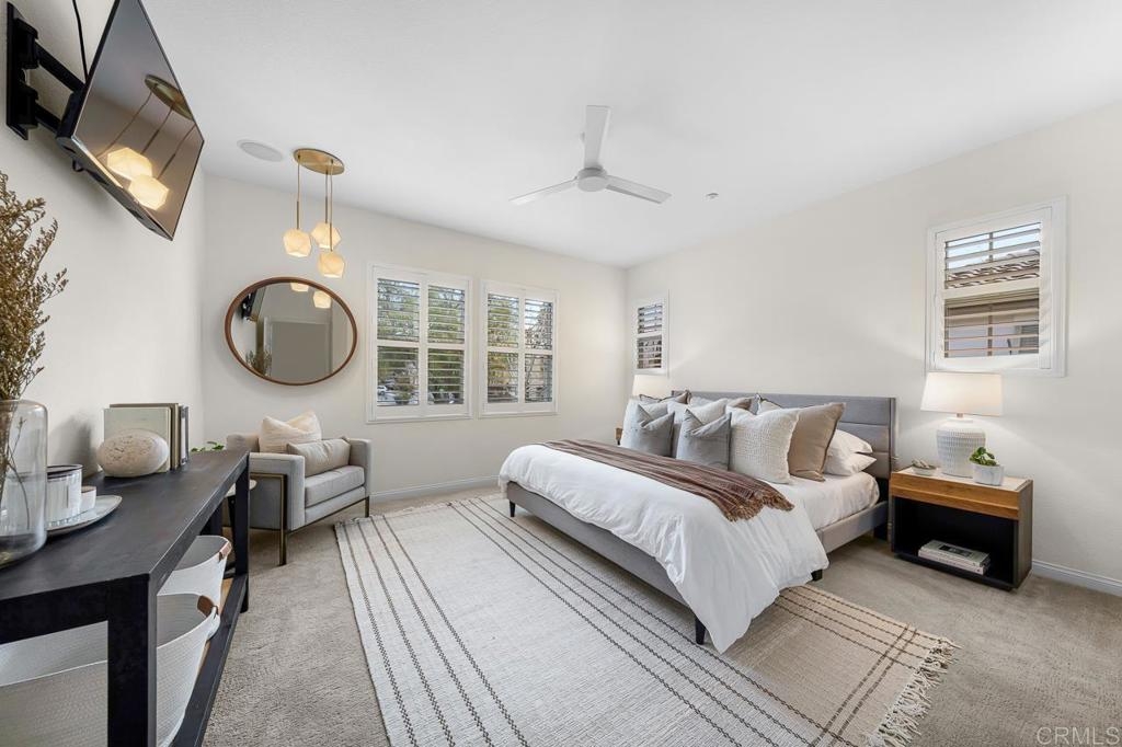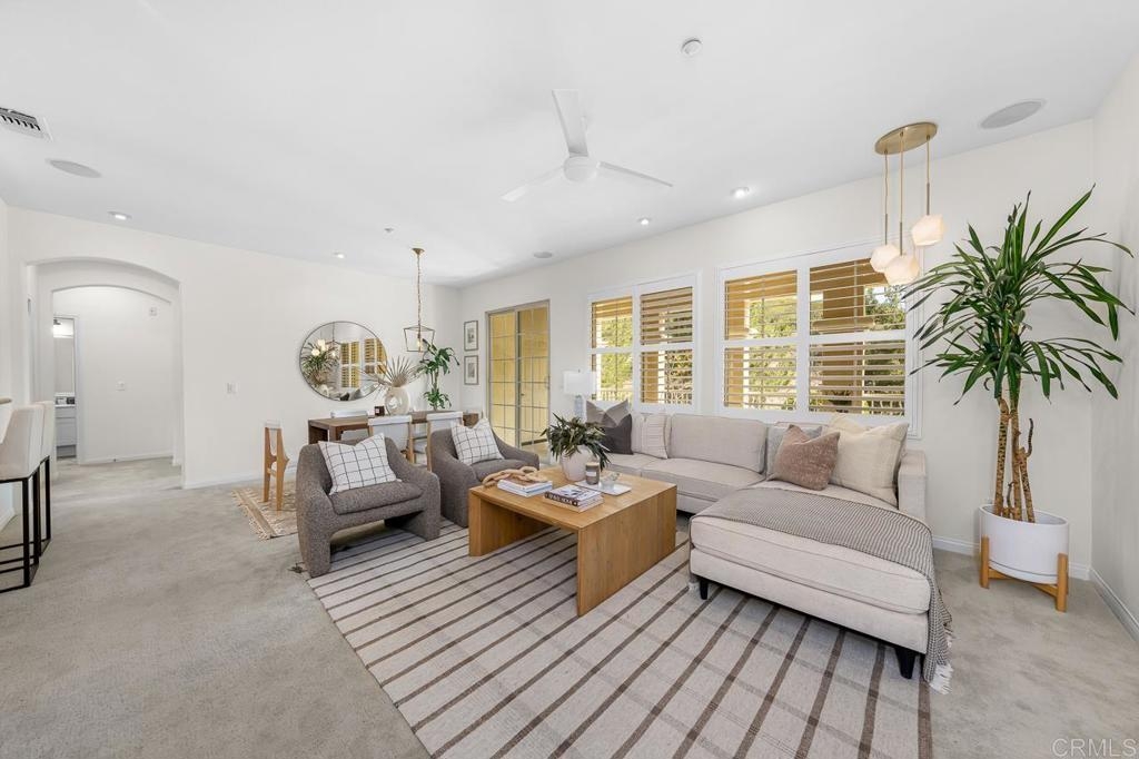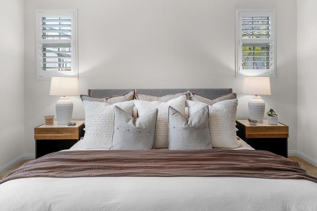 Nestled in the tranquil back of one of the most coveted communities in San Marcos, this exceptional corner unit townhouse offers the perfect blend of privacy, modern comfort, and scenic beauty. Boasting expansive views of the surrounding hills, this home lives like a single-story with a thoughtful split floor plan that provides both space and function. The heart of the home is the spacious living area, featuring a cozy fireplace, abundant natural light, and direct access to an oversized balcony perfect for enjoying your morning coffee or evening sunsets. The open concept design flows effortlessly into a well-appointed kitchen, complete with luxurious granite countertops, a walk-in pantry, and a convenient breakfast bar – ideal for casual meals or entertaining guests. On one side of the living room, you'll find the serene primary suite, a true retreat offering a walk-in closet and an en-suite bath with a walk-in shower, separate soaking tub, dual sinks, and plenty of space to unwind. The small den adjacent to the primary suite provides a perfect space for a home office, child’s play area or private reading nook. On the opposite side of the home, two generous secondary bedrooms and a well-positioned laundry room provide convenience and privacy. This is the largest floor plan available in the community, offering ample living space without compromising on comfort. The home is further enhanced by its prime location in the peaceful and friendly neighborhood of Old Creek Ranch and San Elijo Hills, known for its miles of hiking and biking trails, parks, and community events. The complex boasts a resort-style pool and spa, BBQ area, and playground, perfect for gatherings and outdoor entertainment. The charming Carlsbad and San Elijo shopping centers are just a stone's throw away, offering everything you need just minutes from your doorstep. Whether you’re seeking tranquility, adventure, or a convenient lifestyle, this home offers it all.