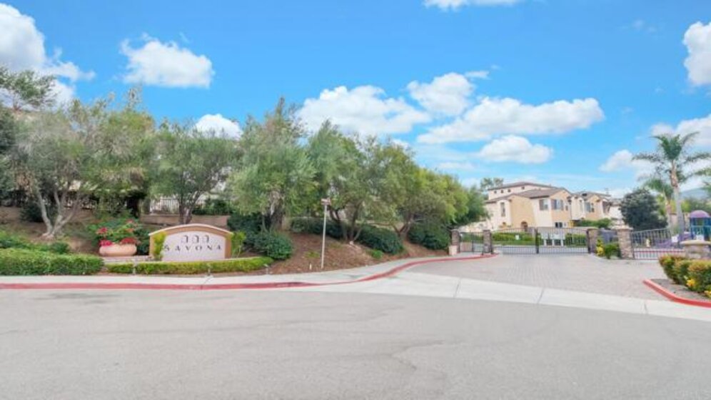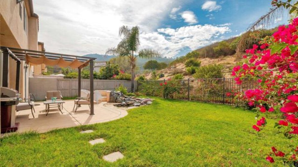 Light and bright, this floor plan shows like a model and feels like a detached home. Premium SW facing lot backs up to protected open space with beautiful views of the hillside from all 3 bedrooms and living area. Large fenced yard with grassy area, waterfall with koi pond, separate seating area with built in fire pit, and sliding canvas patio cover. Nicely updated kitchen and baths. Crisp, clean, white Porcelain tile downstairs and wood look laminate floors upstairs. Other upgrades include Plantation shutters, granite counter tops, chair rails & crown moldings throughout. Chill out with central A/C and 4 ceiling fans. Two attached 1 car garages with epoxy coated floors and storage rack. Gated Community with pool, playground, and Low HOA/mello roos. Convenient to CSUSM, shopping, dining, freeways, and more!