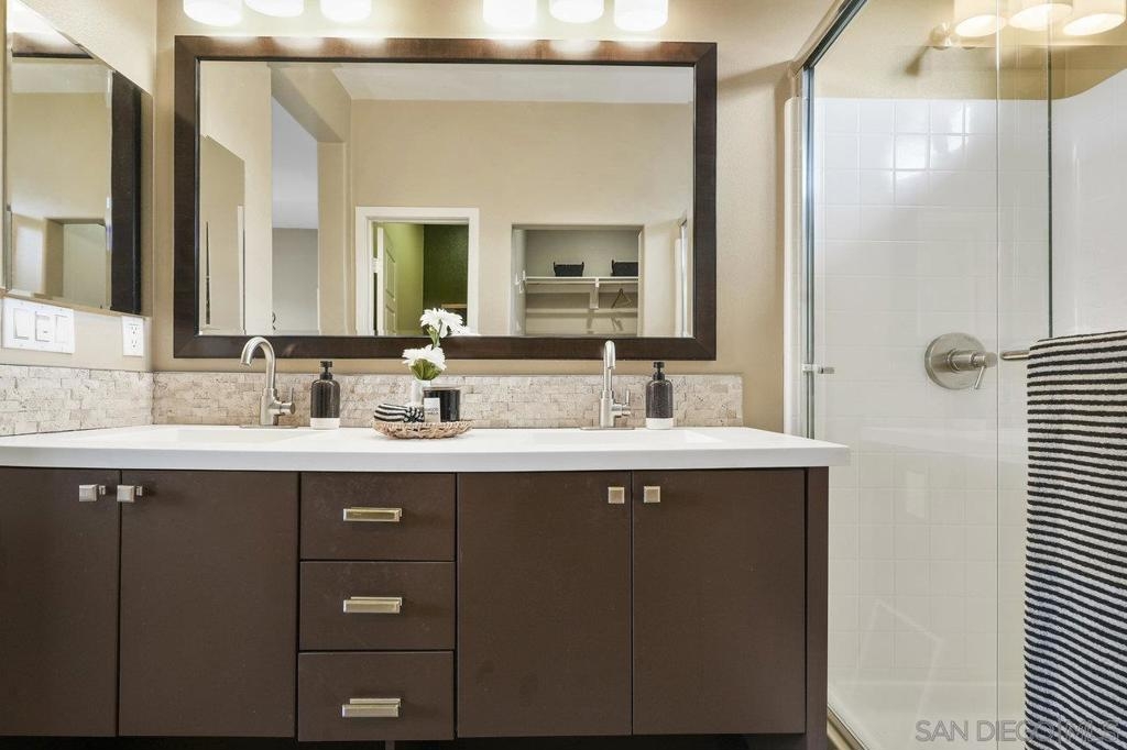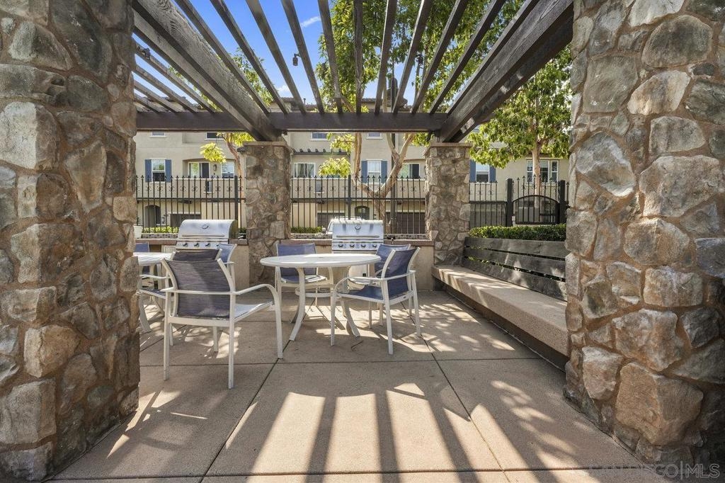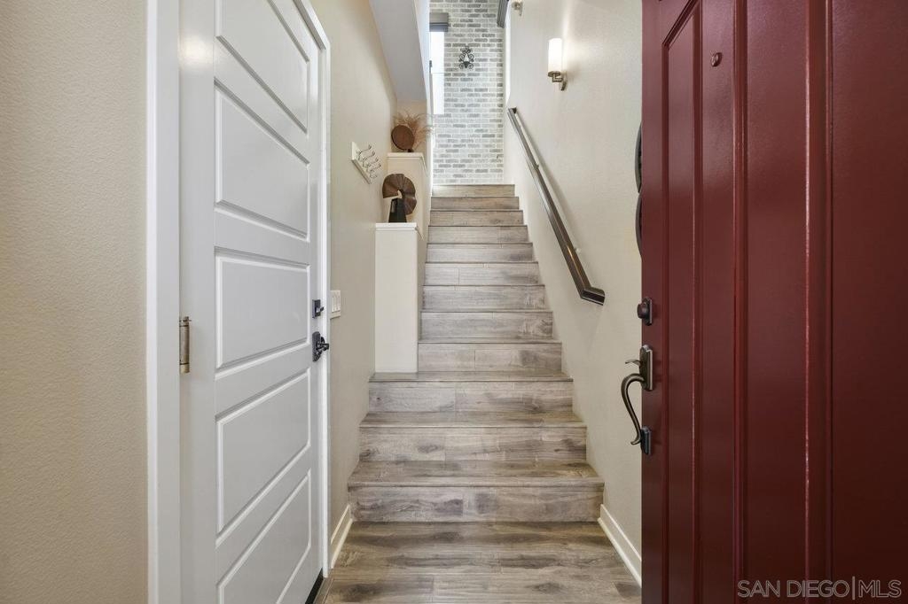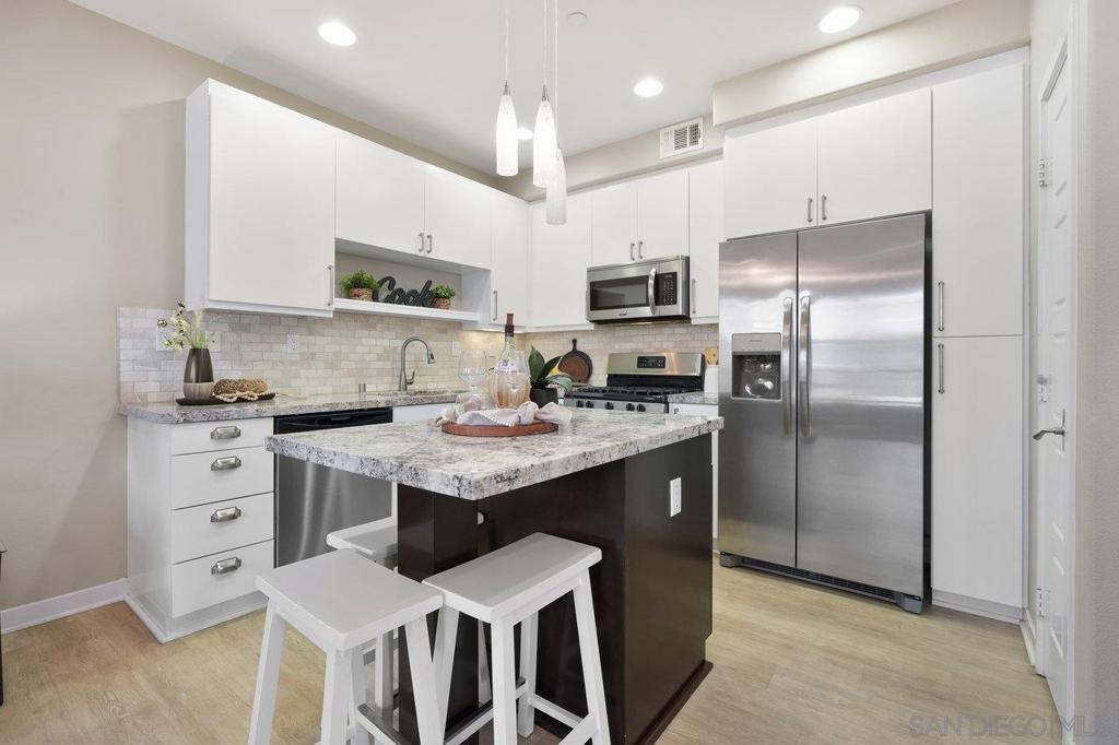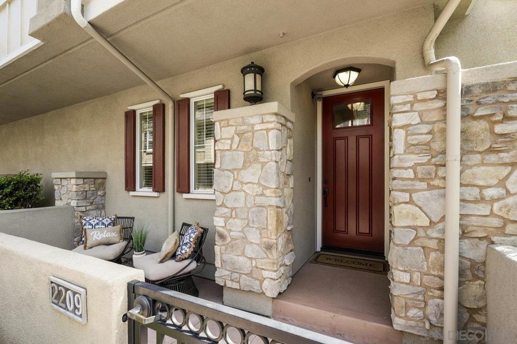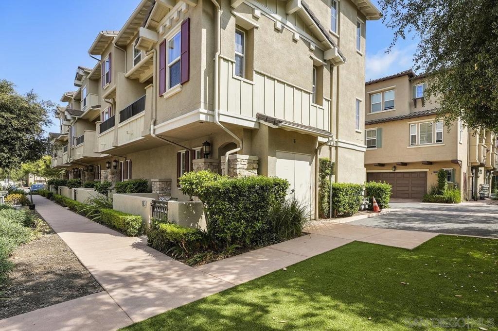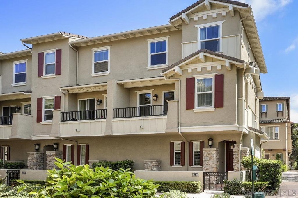It's here! One of the finest homes in arguably THE best location within the tree-lined neighborhood of Solaire, this one is loaded with unique features that make it stand out from the rest. RARELY AVAILABLE! One of only two homes in the complex that is a true end unit facing the garden with an extra-large lower patio combined with a large upper balcony, making for memorable times entertaining inside and out. Step inside and you'll be equally blown away by the stunning finishes throughout. It shows like a model! The main floor features an open, airy feel with large windows that offer views and an abundance of natural light. Gorgeous kitchen remodel with new stainless-steel appliances and granite counters spanning the large prep space and center island. Tons of storage, including a dedicated pantry! Two brick feature walls make the space a stylish retreat. The elegant powder room is sure to impress. Impeccable layout that lives very much like a single-family home (only one shared wall and no one above or below). The main level bedroom makes a great office or guestroom. Upstairs, you'll find two additional spacious bedrooms and two full baths. The primary bedroom is large with a spa-like bath and walk-in closet. Don't forget the attached 2-car garage with direct access and custom storage cabinets. A short distance from San Elijo Hills & La Costa Town Center shopping, restaurants, hiking trails, parks, schools & beaches. The resort-like complex features a pool, spa and fire pit. This home checks all the boxes and provides a private retreat that is awaiting its lucky new owner.