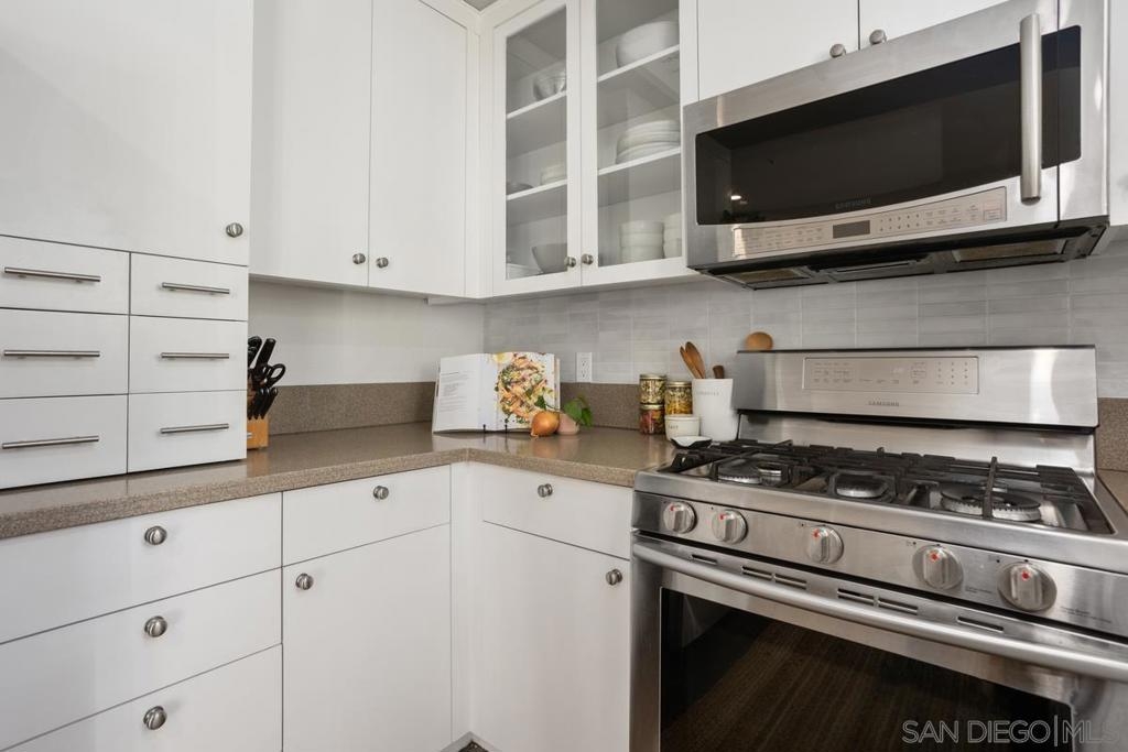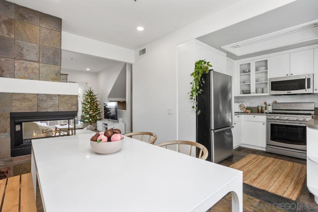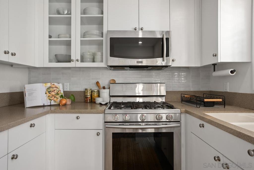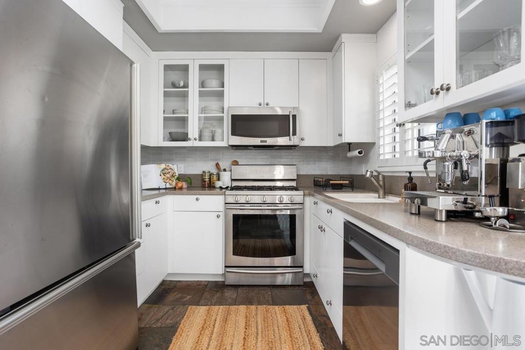 This immaculate 2 bed 2 bath town home is situated in the highly sought after gated community of Villa Aspara. With only 1 adjoining wall to living spaces, this well thought out floor plan lends to effortless family living. Kitchen features custom glass cabinets, all stainless steel appliances and a serene eat in dining area. The family areas boast beautiful sweeping slate flooring, a cozy fireplace, and upgraded French doors leading to a tranquil enclosed balcony seating area. Both bathrooms have been fully remodeled with beautiful modern custom tile and newer vanities. Both bedrooms are large and spacious with the primary bedroom including a walk-in closet. The home boasts lots of natural light, plus has its own private back yard space for grilling and play time! The gated community offers plenty of peaceful grassy areas, quiet street for children’s play time, a good sized community swimming pool, two big courtyard areas with pretty fountains and well landscaped gardens. The townhome is located in a very convenient area, close to freeways, colleges, schools, coffee shops, restaurants and entertainment.