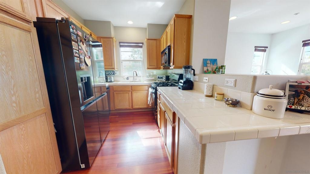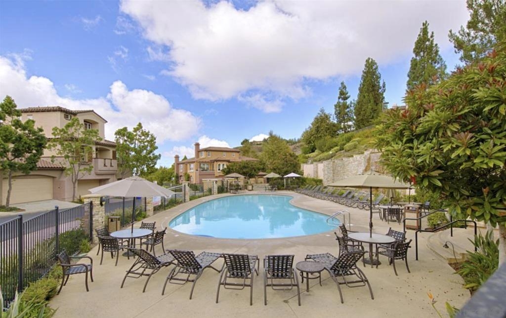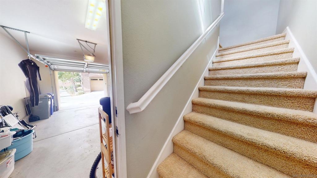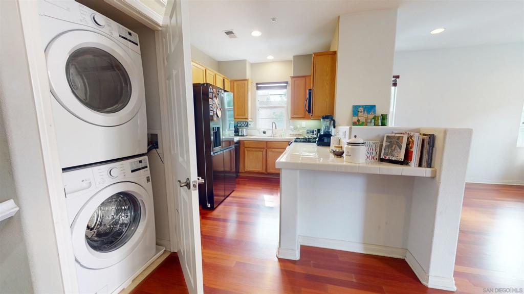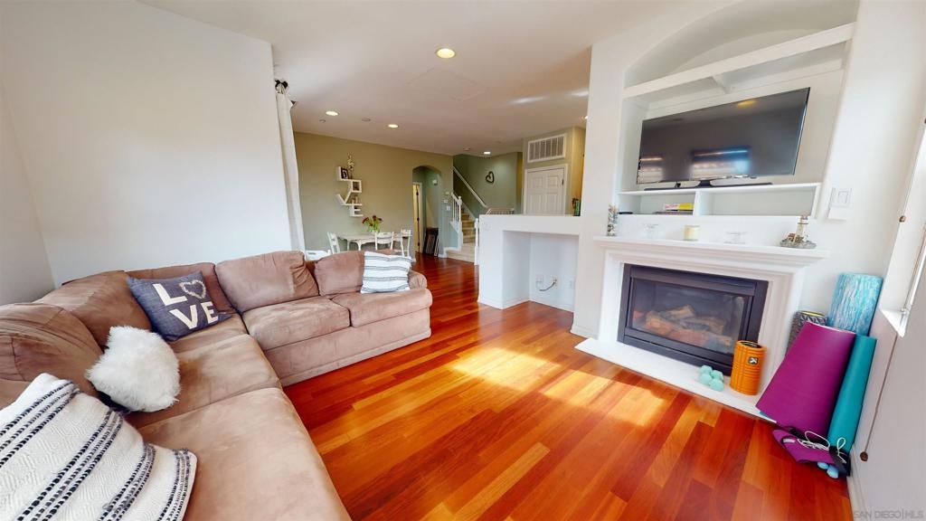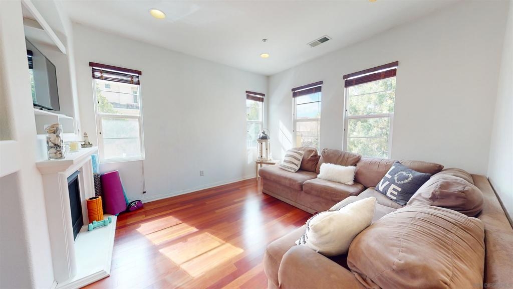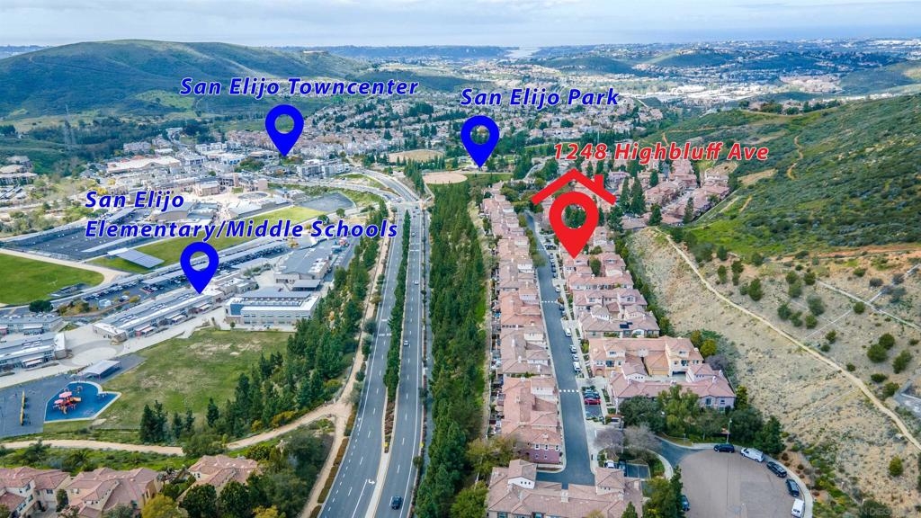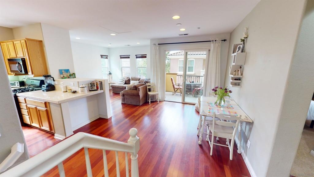 Welcome to the gated Westridge Community in the coveted San Elijo Hills of San Marcos. This end-unit 2bed 2bath 1,111sf home is sure to impress. Home has 3 levels: garage and entry on ONE, living and 2nd bed/bath on TWO, primary bed/bath on THREE. Only 2nd level shares one wall w/ neighbor; otherwise, no one above or below. Windows and balcony face south and east for light & breeze. Flooring is Brazillian hardwood in living areas, carpet in bedrooms. Full size stacked washer dryer conveniently located in living area. Westridge Community is private, gated and has beautiful pool w/ water feature, hot tub/spa, & bathrooms. Monthly fee detail: $263/mo to Westridge HOA--$85/mo to San Elijo Hills master HOA--$134/mo Mello Roos ($69 of this expires in 2035)--$171/yr Westridge special assessmnet (1 year, ends JAN'24). TOTAL= $653/mo at moment.