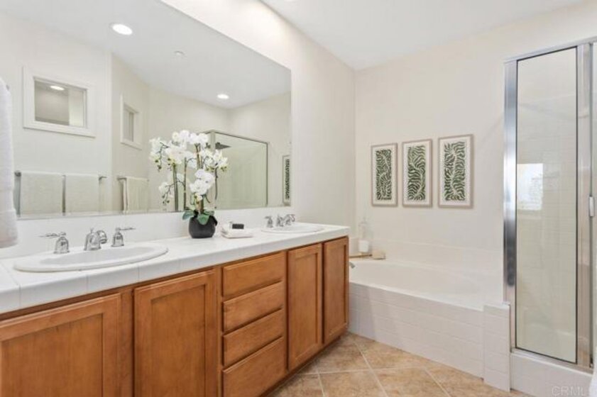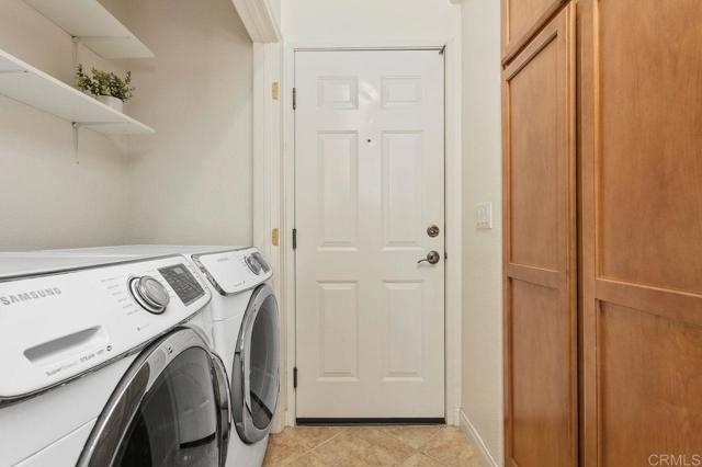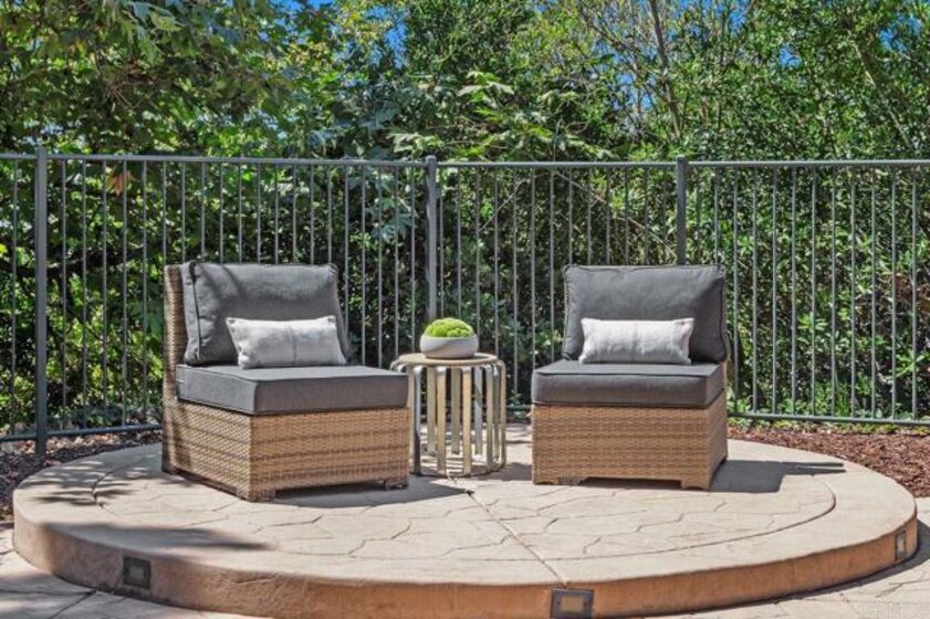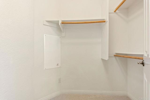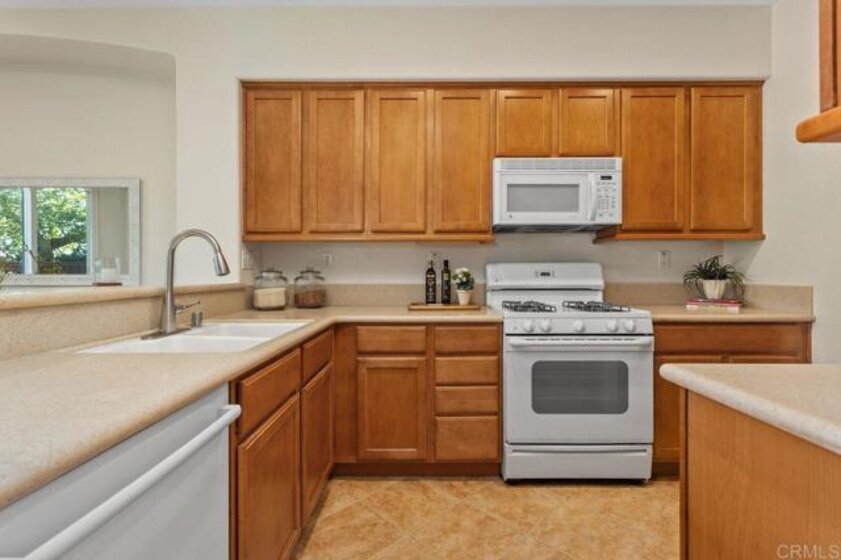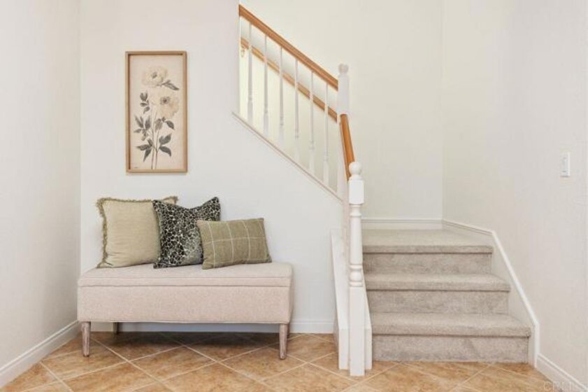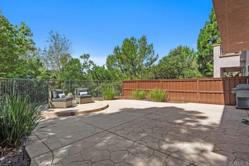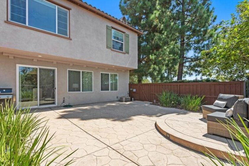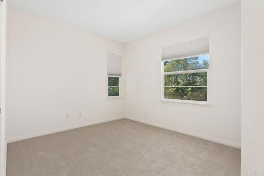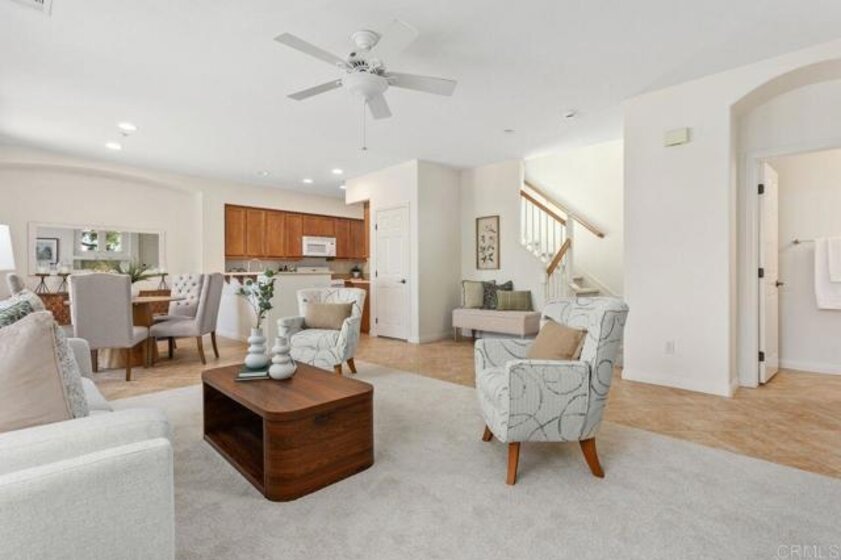 Rarely available prime location on the rim, with one of the largest patios and outdoor space in the complex. It feels like a single family residence. Freshly painted with new carpet throughout. It is turn-key ready to move in. The kitchen has a gas stove, large pantry, lots of cabinet and counter space. The refrigerator, washer and dryer are included. And don't miss the huge closet with extra storage under the stairs. Ceramic tile flooring extends from the kitchen into the dining room, while the living room has plush new carpet, recessed lighting, and a gas fireplace. The spacious primary bedroom includes a walk-in closet, separate shower and tub, ceiling fan and a fabulous view all the way to the ocean! Two additional bedrooms and a bath are also upstairs. Also features a 2-car attached garage, and central A/C. Located in the gated community of Westridge at San Elijo, this is an end unit with mountain views, next to an open green space with pine trees for added privacy, and lots of guest parking. The Westridge community provides a resort-like pool and spa area complete with a stunning water feature. There is also easy access to 18 miles of maintained trails, parks, playgrounds, ball fields, dog park, and top-rated schools. In addition, the popular Town Center offers shops, a grocery store and a selection of restaurants.