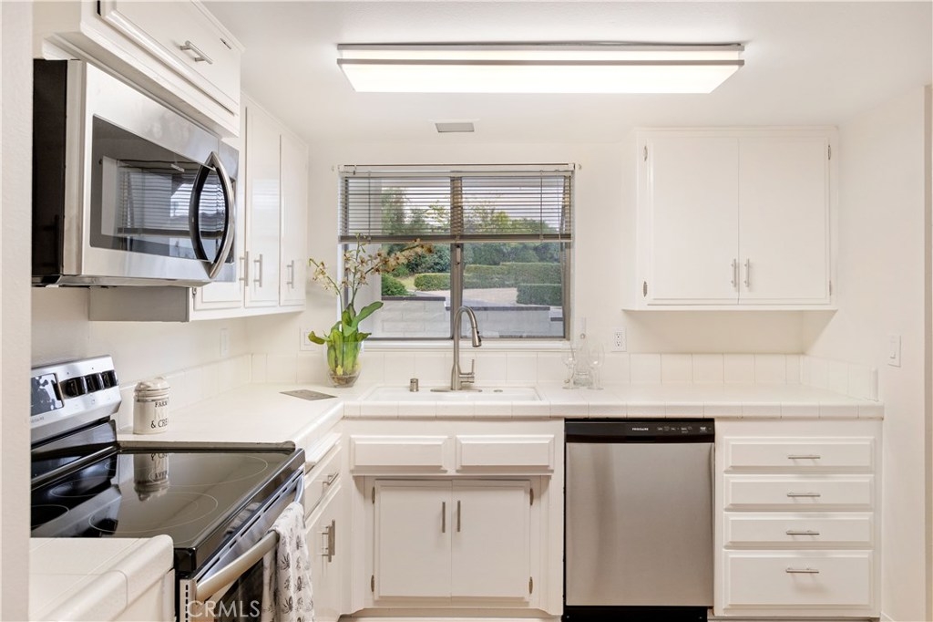 Rare entry level condo in Lake San Marcos offers mountain views and easy living lifestyle. Clean & cute! This one bedroom one bathroom home features new carpet and flooring throughout including freshly painted interior walls. The kitchen has been refinished with brand new stainless steel appliances and new sink faucet. En suite bathroom features two separate vanities with new faucets. Parking includes one covered parking spot and one tandem spot. Includes community laundry close to unit. Sliding door off living with covered patio looking out to mountain views. Walking distance to Lake, Golf course, restaurants and retail shops. HOA includes water, sewer, trash, roof, laundry area, exterior & common area maintenance. No age restrictions. Come see today.