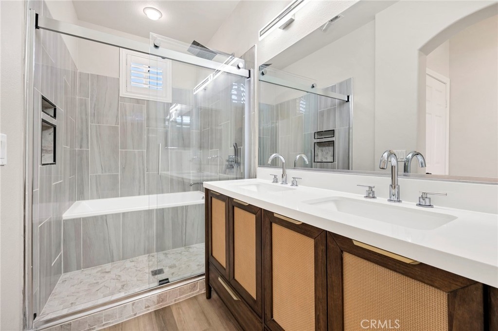 Backup offer welcome! Welcome to this remodeled and magnificent home located in the highly sought-after gated community of Springfield nestled on San Elijo Hills. The property features 2 beds and 2 full baths plus office with decent French glass door which could be converted to the 3rd bedroom. Modern renovation throughout the property enhances this home ambiance and sense of space. Every single detail reflects care and consideration. Laminate floorings on the most, Planation shutters throughout, LED on all the ceiling lights, Smart Thermostat, Trendy-tiles for the fireplace added a sense of depth and layering. The gourmet kitchen highlights: Quartz countertops and backsplash, Solid wood cabinets with stainless organizer inside and underneath lighting, Complete with upgrade appliances: The powerful range Hood, IH oven, Electric stove, "Sharp" quiet and clean dishwasher and Ispring water filtration system and stainless-steel utility sink. Bathrooms include Tall smart sense toilets, Japanese-style tub and walk-in shower, "Kohler" flameless sliding shower doors, Quartz top vanity and good textured faucets and more. The community amenities offer the POOL/SPA and a small park which connects the walking trail with beautiful mountain scenery. The community located only 5 minutes away from Cal State San Marcos ,10 minutes away from the city of Carlsbad. Having a walking distance to great schools, conveniently close to all the living needs!