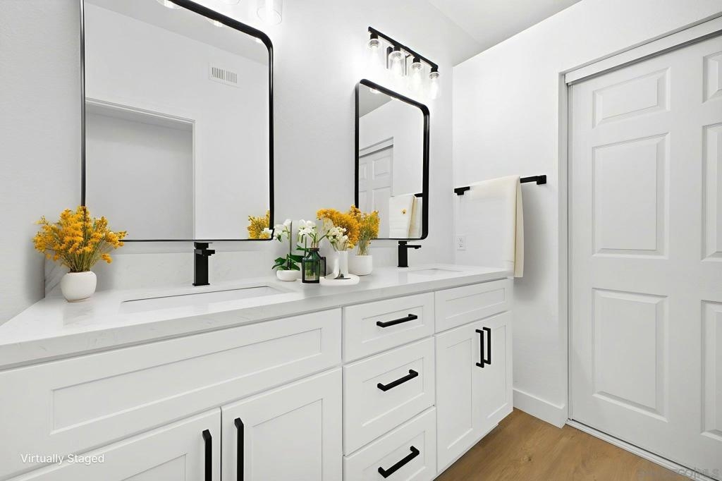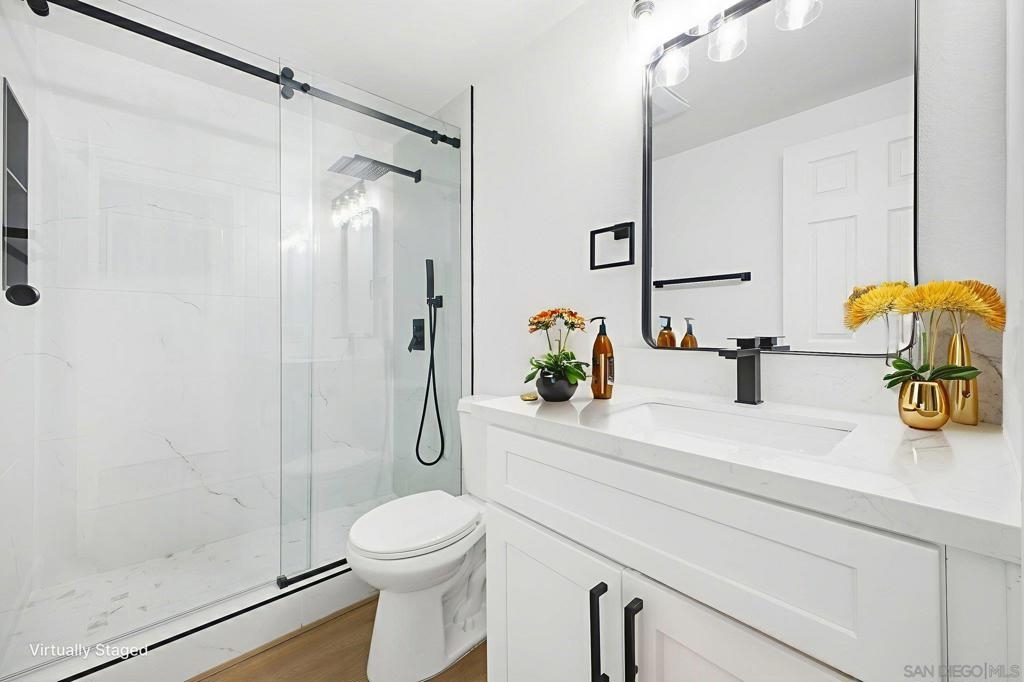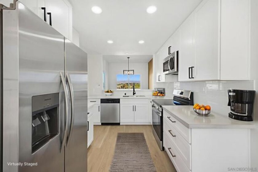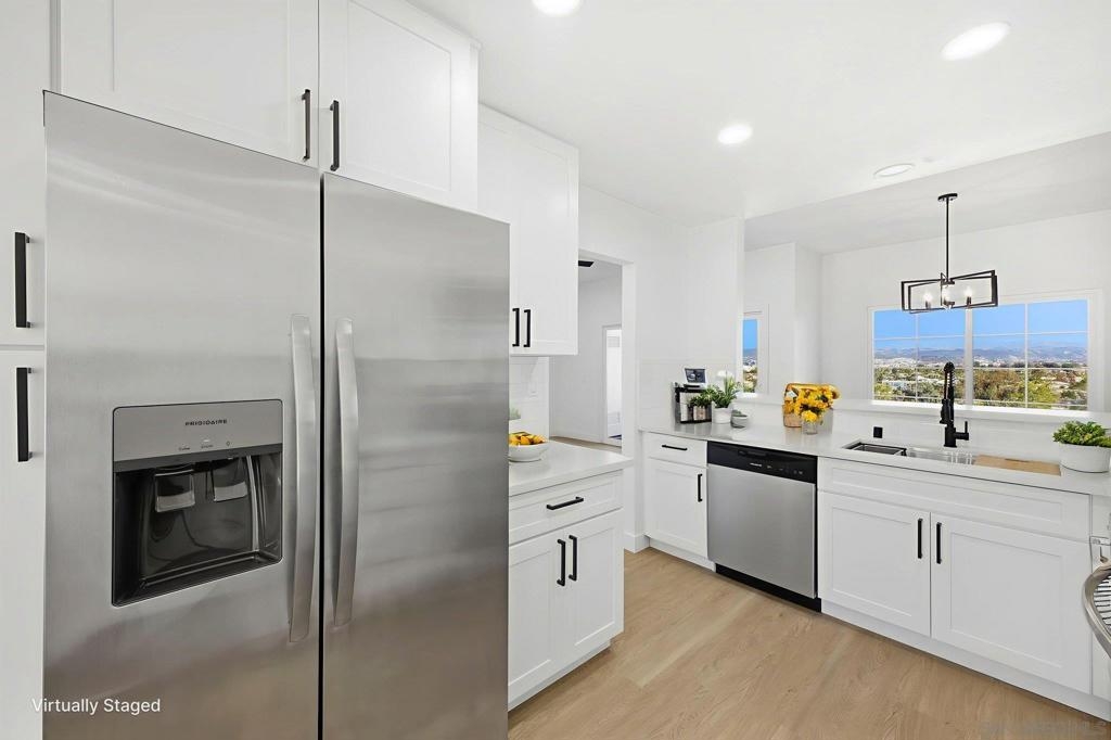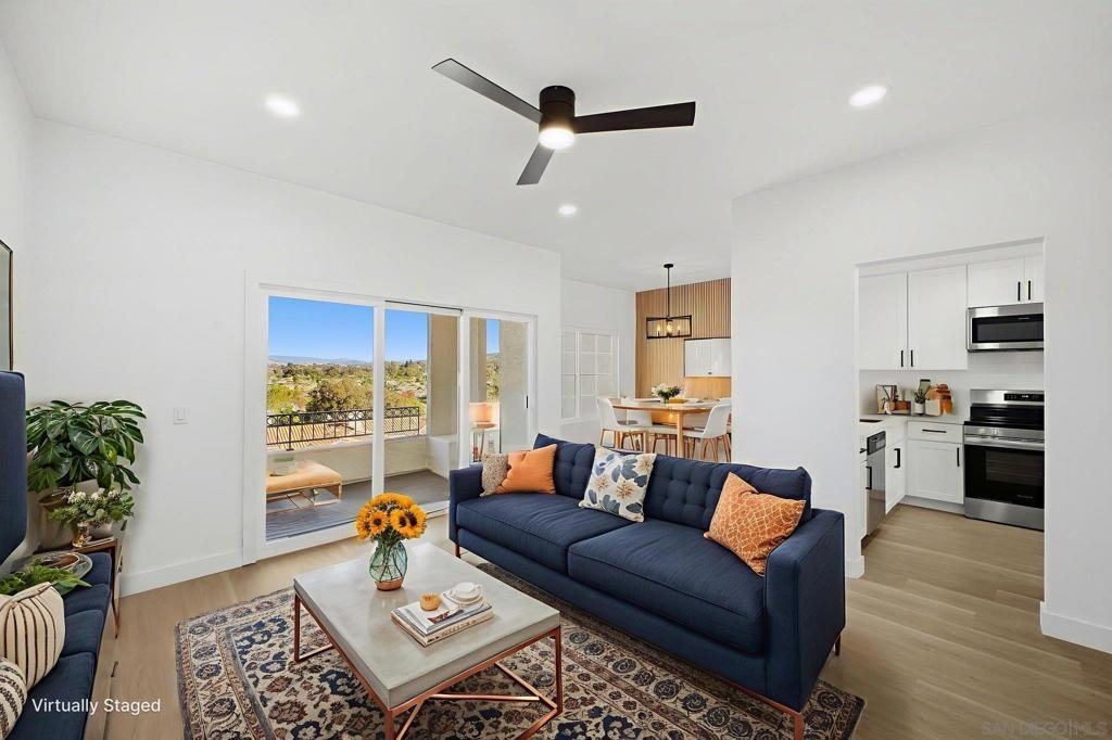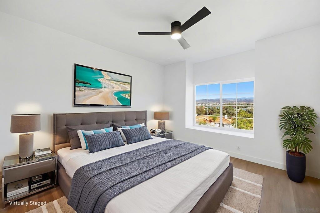 This stunning 2 bedroom + den condo has a 180-degree unobstructed and panoramic view of all of Lake San Marcos and the rolling mountains with snowcapped mountains during the winters in the distance. The home has been fully remodeled featuring new wood vinyl flooring throughout, newly remodeled kitchen and bathrooms, living spaces with 9 ft ceilings. The large kitchen features plenty of storage, with new stainless-steel appliances, stove also has an air fryer inside the oven and a cozy breakfast nook with stunning natural light. Dining room with has a beautiful slat wood panel accented wall. Unit includes a 2-car detached garage space. The HOA includes a ton of amenities including access to all Lake San Marcos amenities - including multiple pools, pickleball/tennis courts, Lake San Marcos activities (boating, kayaking, paddleboarding, fishing, etc.). Also includes 24-hour security patrol. Enjoy a cup of joe watching the sunrise on the balcony over looking the lake. It is a must see. Interior pictures are virtually staged