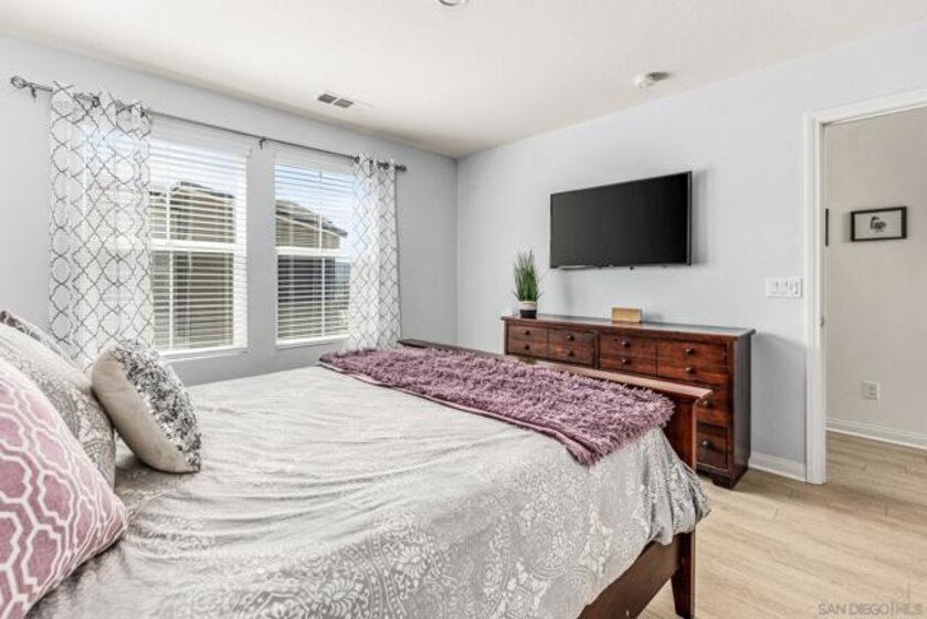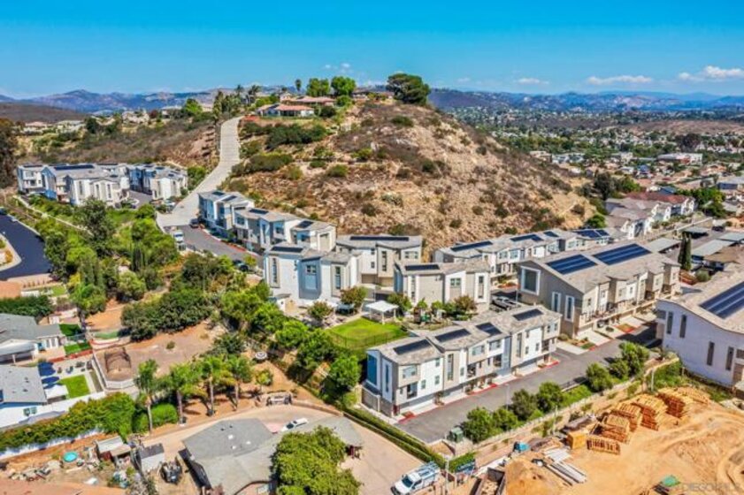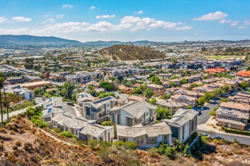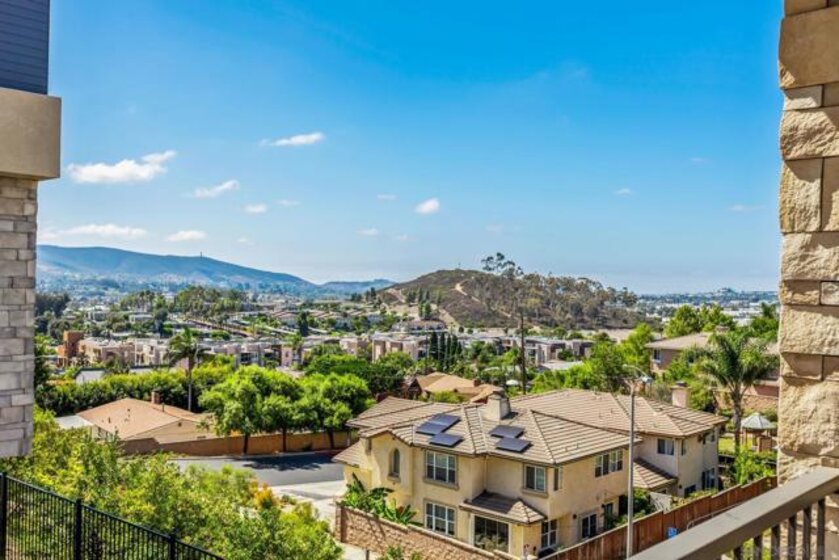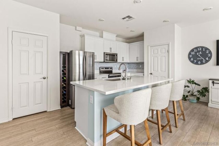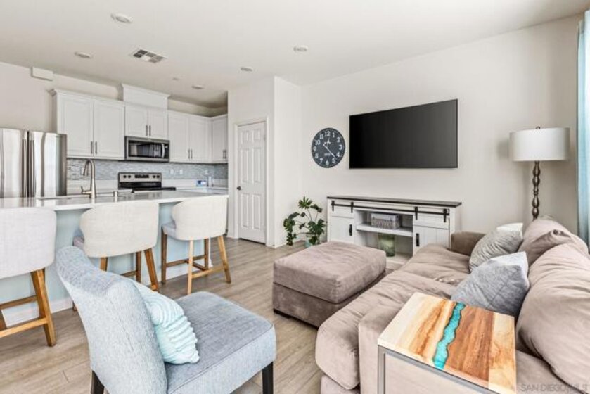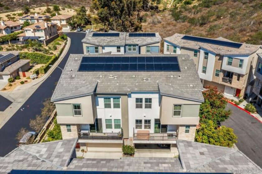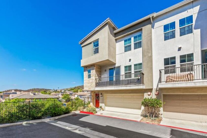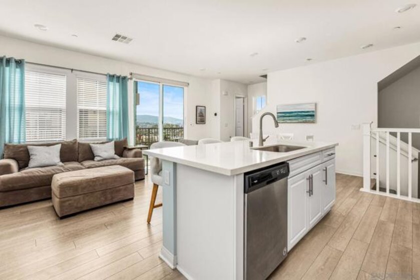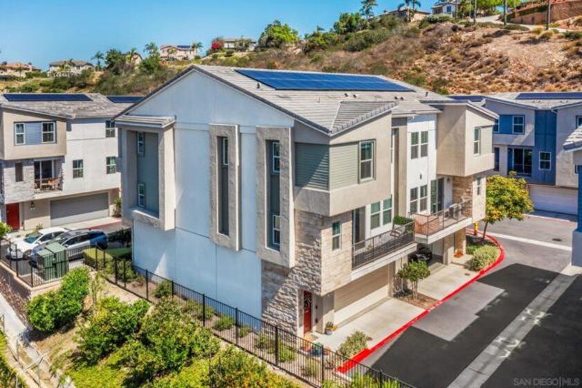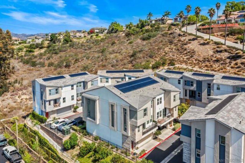 Fantastic Views! Enjoy this tastefully appointed hilltop townhouse, perfectly situated to take advantage of the great views and wonderful breeze. Immaculate end unit with great location & views. Save with energy efficient home and owned solar. Open floor plan concept in the main living area. Large gourmet kitchen with Quartz counter tops, stainless appliances, plenty of cabinet & counter space, pantry, large 4x7 island with sink, comfortably seats three. Plenty of natural light, 9 foot ceilings, large sliding glass door leading to balcony, recessed lighting, and Luxury Vinyl Planking flooring. The two upper bedrooms both feature an en-suite bathrooms, dual sinks in the primary bedroom, laundry on upper level also, with cabinets for storage. 2 car garage, & central AC. Viewpointe features a park, BBQ area, playground, & dog park. Home is conveniently located close to Palomar College, Cal State San Marcos, schools, dining, shopping, medical centers and nearby freeway access.