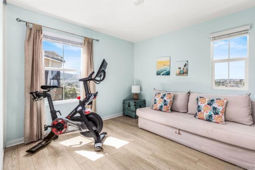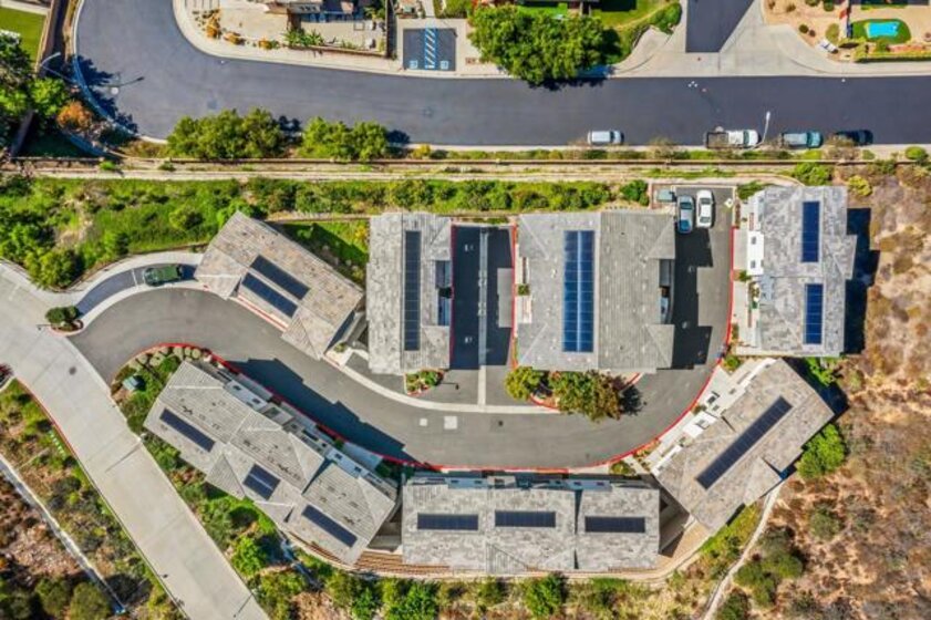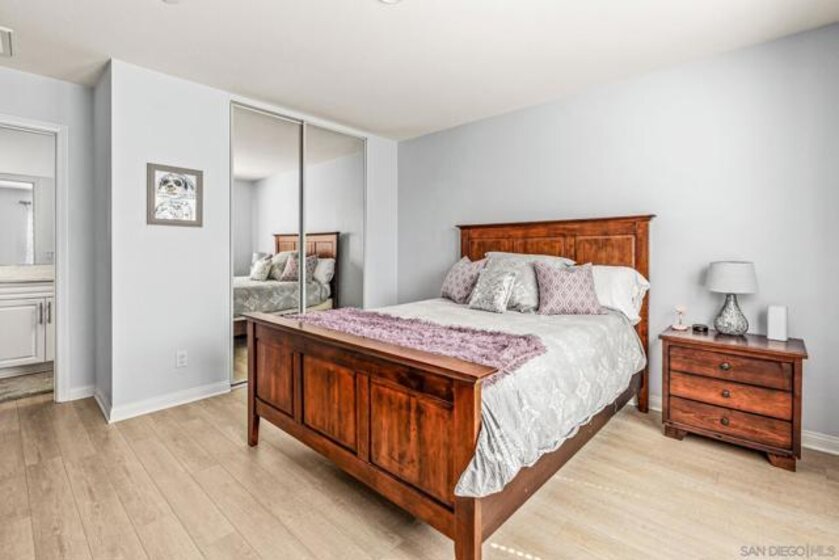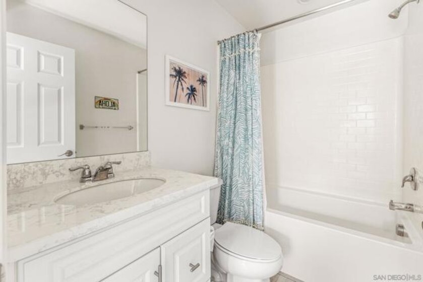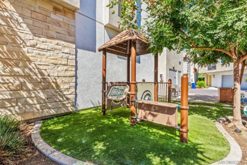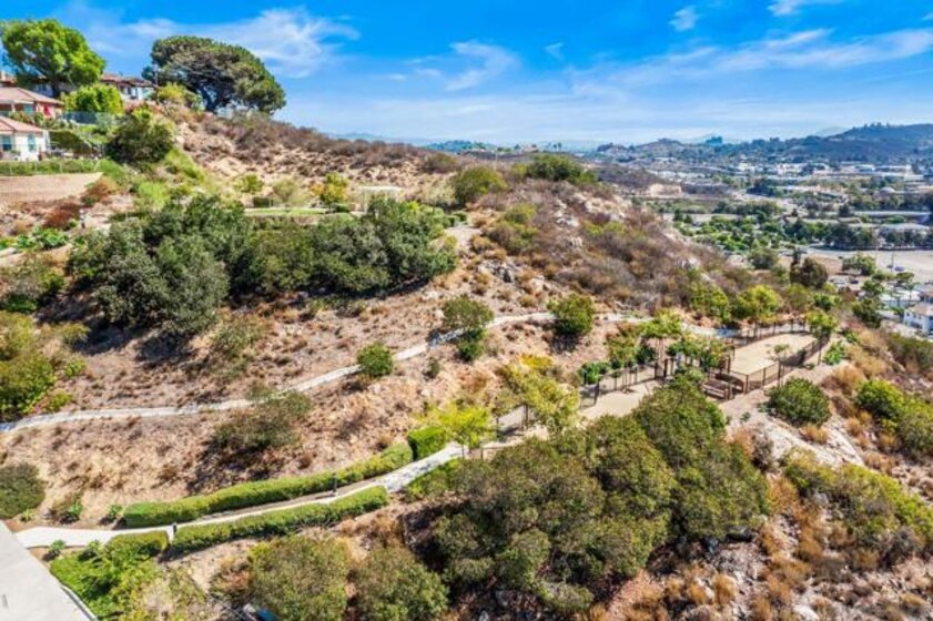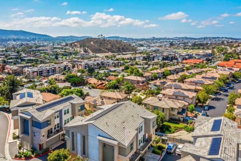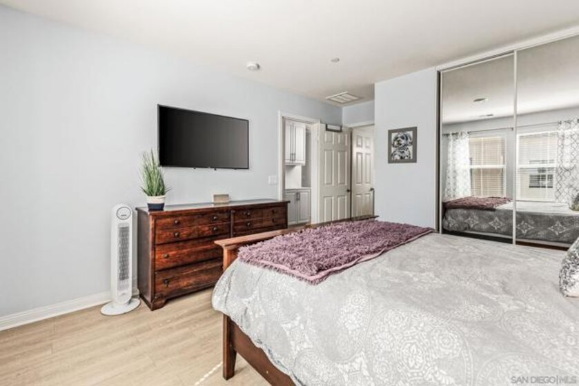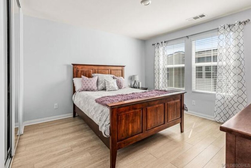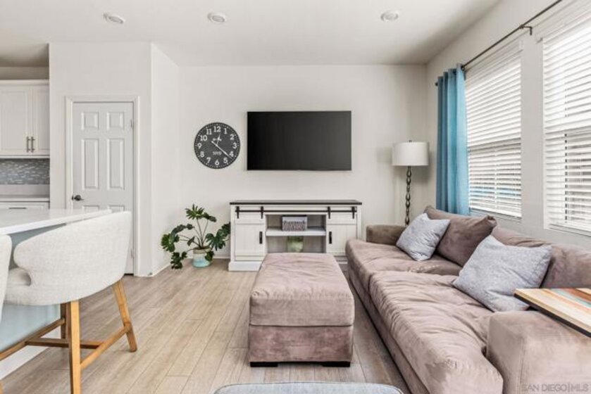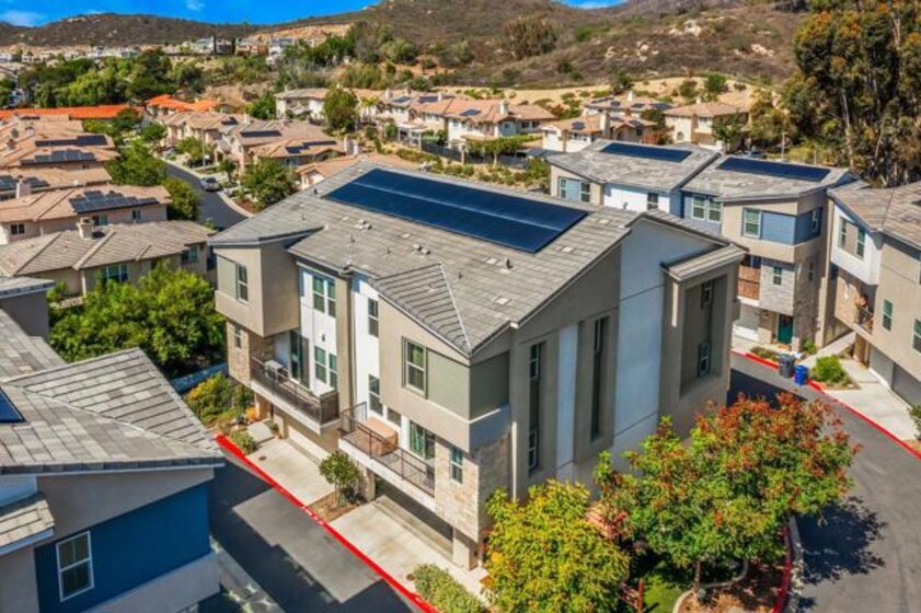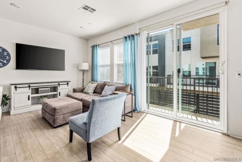 Fantastic Views! Enjoy this tastefully appointed hilltop townhouse, perfectly situated to take advantage of the great views and wonderful breeze. Immaculate end unit with great location & views. Save with energy efficient home and owned solar. Open floor plan concept in the main living area. Large gourmet kitchen with Quartz counter tops, stainless appliances, plenty of cabinet & counter space, pantry, large 4x7 island with sink, comfortably seats three. Plenty of natural light, 9 foot ceilings, large sliding glass door leading to balcony, recessed lighting, and Luxury Vinyl Planking flooring. The two upper bedrooms both feature an en-suite bathrooms, dual sinks in the primary bedroom, laundry on upper level also, with cabinets for storage. 2 car garage, & central AC. Viewpointe features a park, BBQ area, playground, & dog park. Home is conveniently located close to Palomar College, Cal State San Marcos, schools, dining, shopping, medical centers and nearby freeway access.
