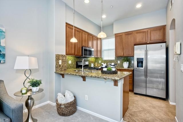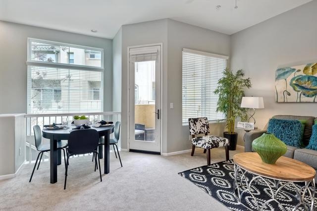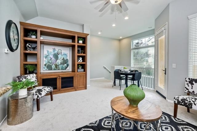Desirable townhome in the gated community of Coronado Ranch in San Marcos. Adjacent to San Elijo and CSUSM (Cal State University San Marcos). Highly rated San Marcos Schools. Soaring ceilings on the main living level and large windows make this home feel very bright & open. Dual primary bedrooms upstairs each have their own ensuite bathrooms. Full sized "side by side" 2 car garage is attached. Washer & dryer, and kitchen appliances all convey. Home has just been painted in a trendy "greige" and brand new carpet, so just move right in! HOA features resort-style amenities including a fantastic pool, tot lot & a gym. Grassy areas throughout conducive for dogs. Convenient location near shopping, tons of restaurants, and hiking trails incl the beautiful Double Peak with views from downtown San Diego to Catalina Island.
