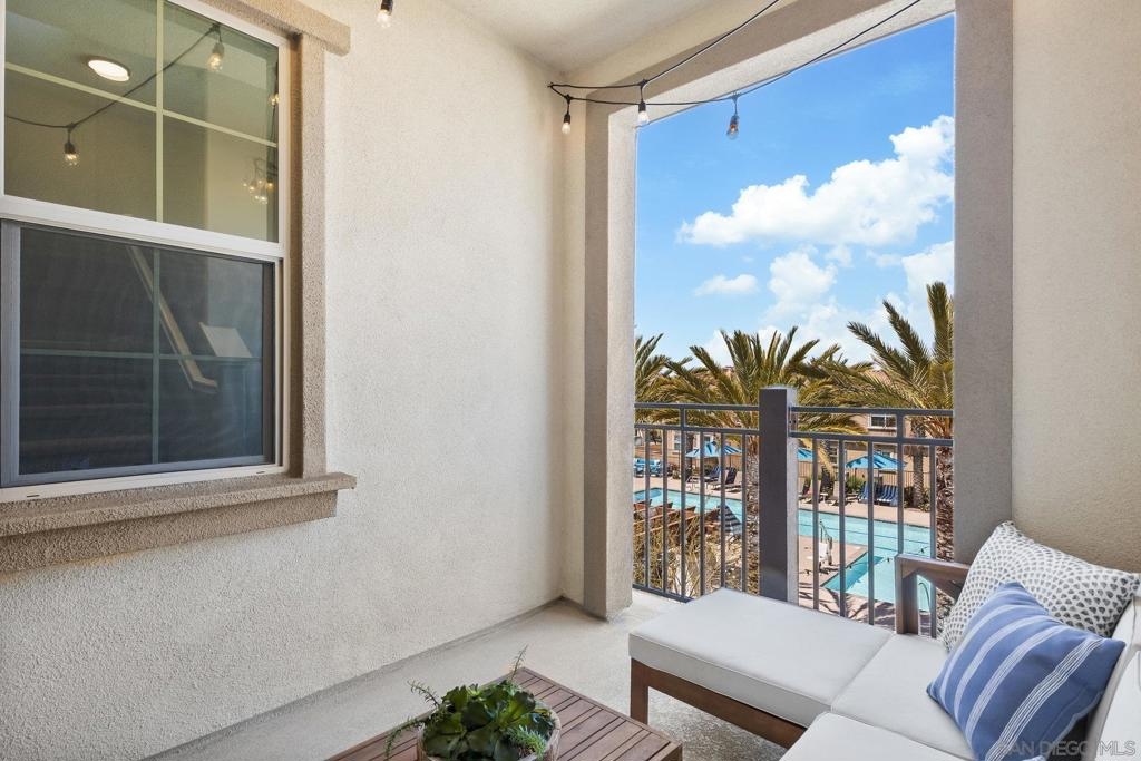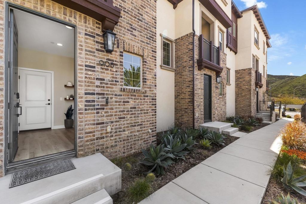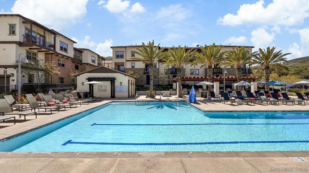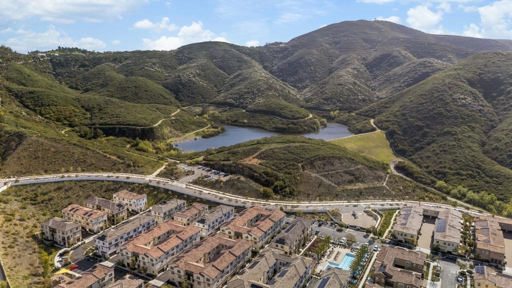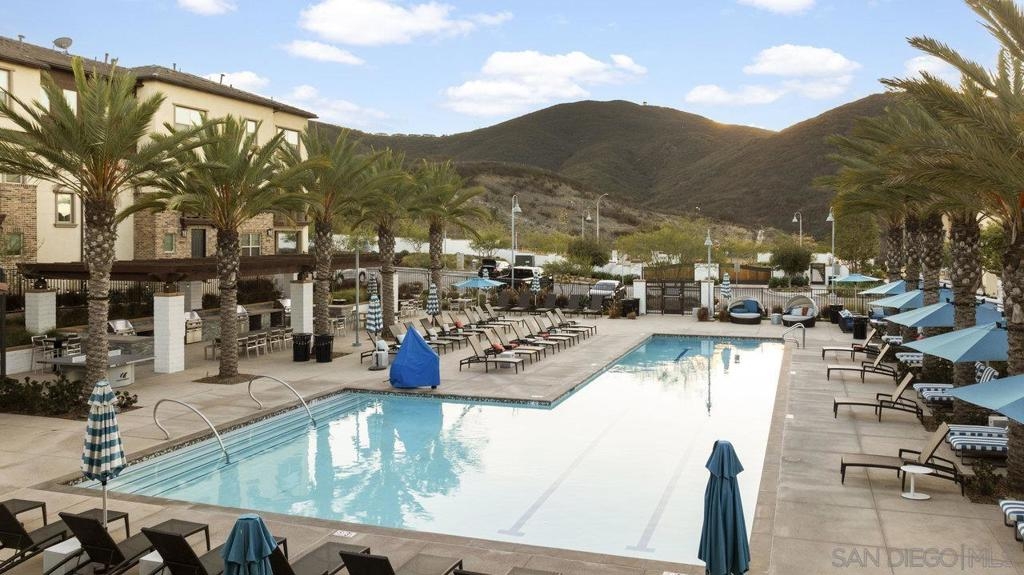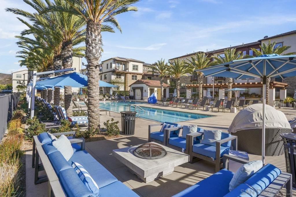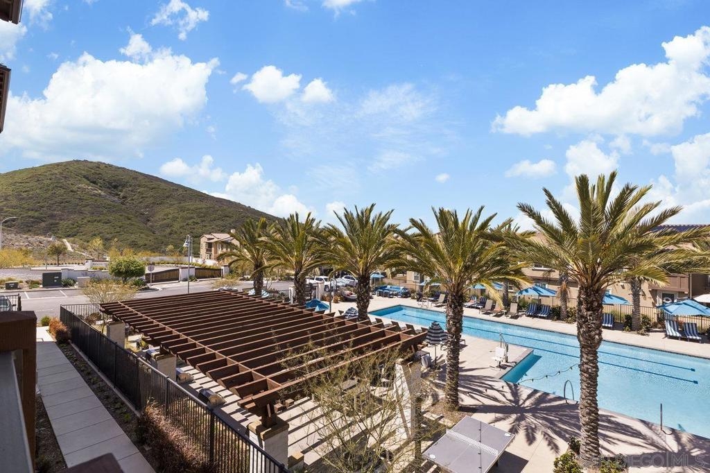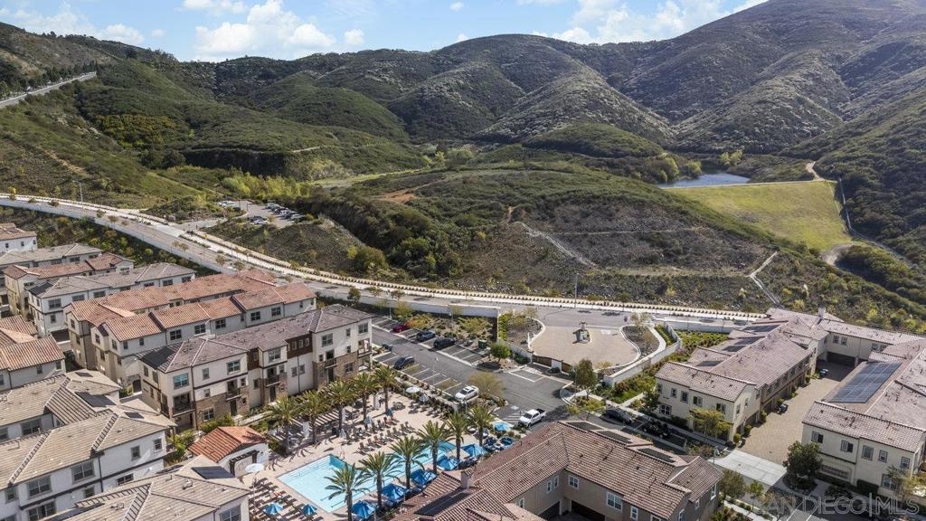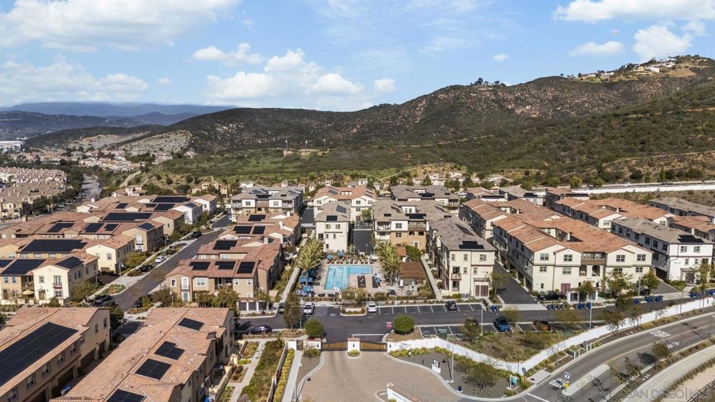 Welcome home to this stunning property in picturesque Latitude at Rancho Tesoro! Set against the scenic hills, this gated community with resort-style amenities, including a pool, BBQs, loungers and more, offers an incredible lifestyle and is situated within the boundaries of sought-after Double Peak School. Built in 2021 and featuring owned solar, this pristine townhome boasts a premium lot with views of the pool and surrounding hills. Beautifully-maintained and upgraded throughout, this 2 bedroom, 2.5 bathroom, 1336 ESF smart home with fiber connectivity lives large with a fantastic open floor plan. Upon entering, you’re greeted by a welcoming foyer with storage and entry to the 2-car garage with EV charger. Continuing upstairs, the main living floor offers plentiful natural light and is perfect for entertaining with the living, dining, and kitchen areas all leading out to a large covered balcony with a quintessential San Diego palm tree view. The upgraded kitchen, with its expansive counter space and pantry, is the heart of the home — perfect for effortless living and enjoyment. Offering versatility, both bedrooms have attached bathrooms, and laundry with storage is upstairs as well. The primary suite features an upgraded bathroom with walk-in closet and dual vanity. Conveniently located close to trails, shops and restaurants, this home offers a sensational lifestyle that takes full advantage of the indoor-outdoor living available in Rancho Tesoro. From the immaculate interior to the neighborhood amenities, come see for yourself how amazing life could be on Blackstone Dr.
