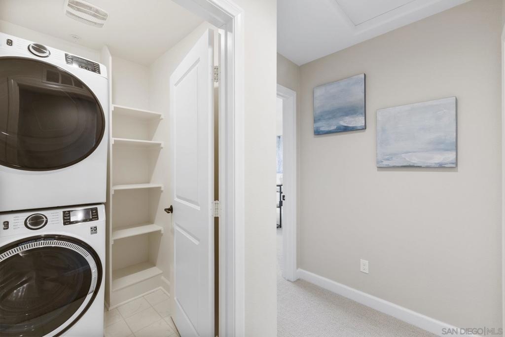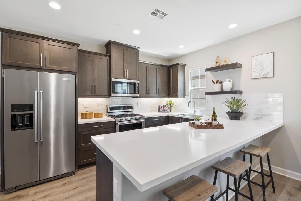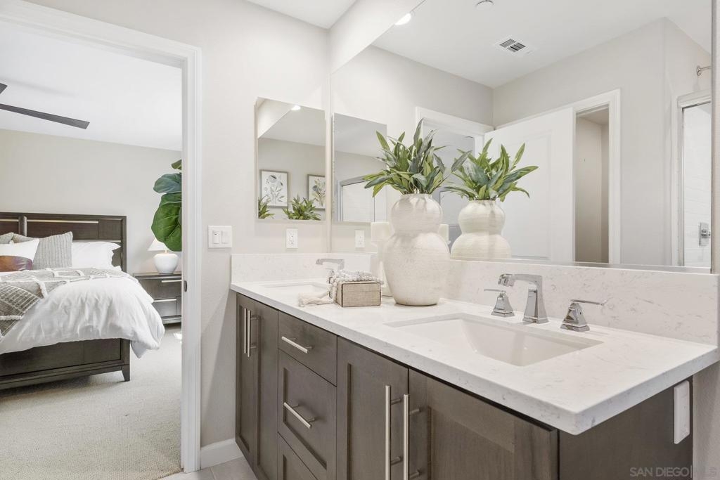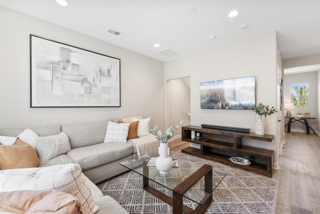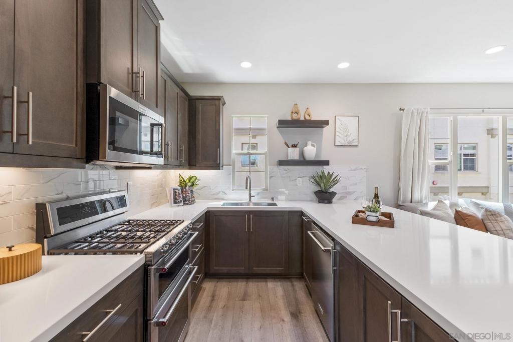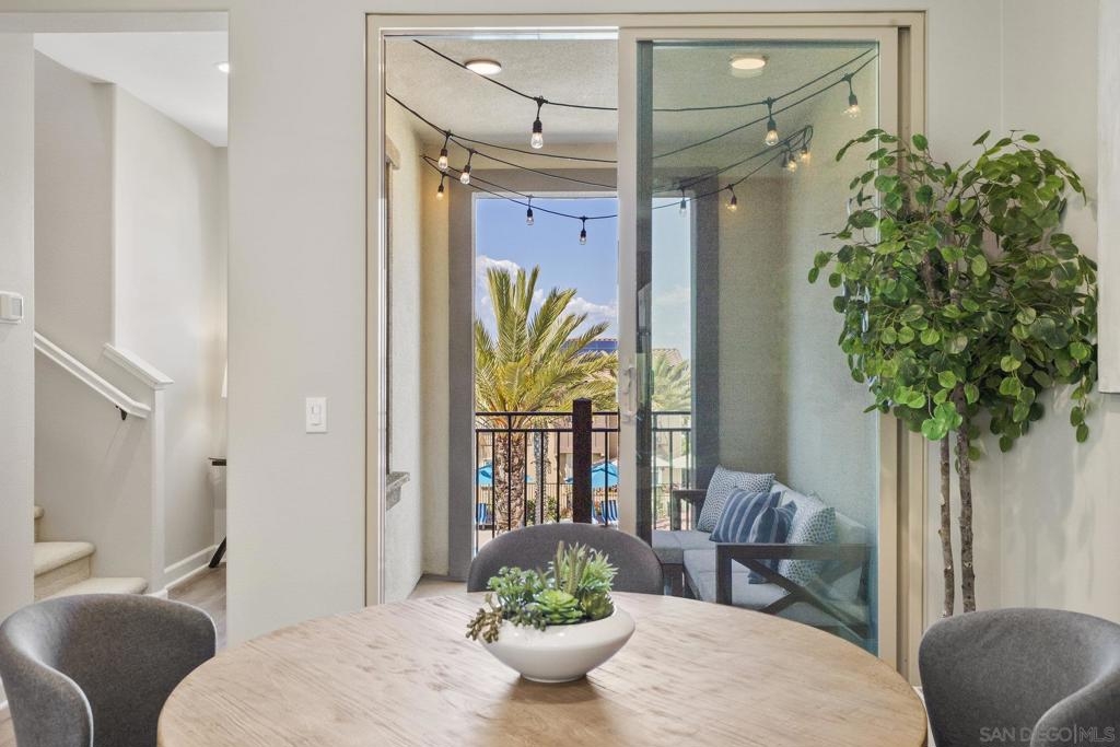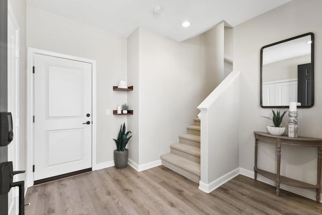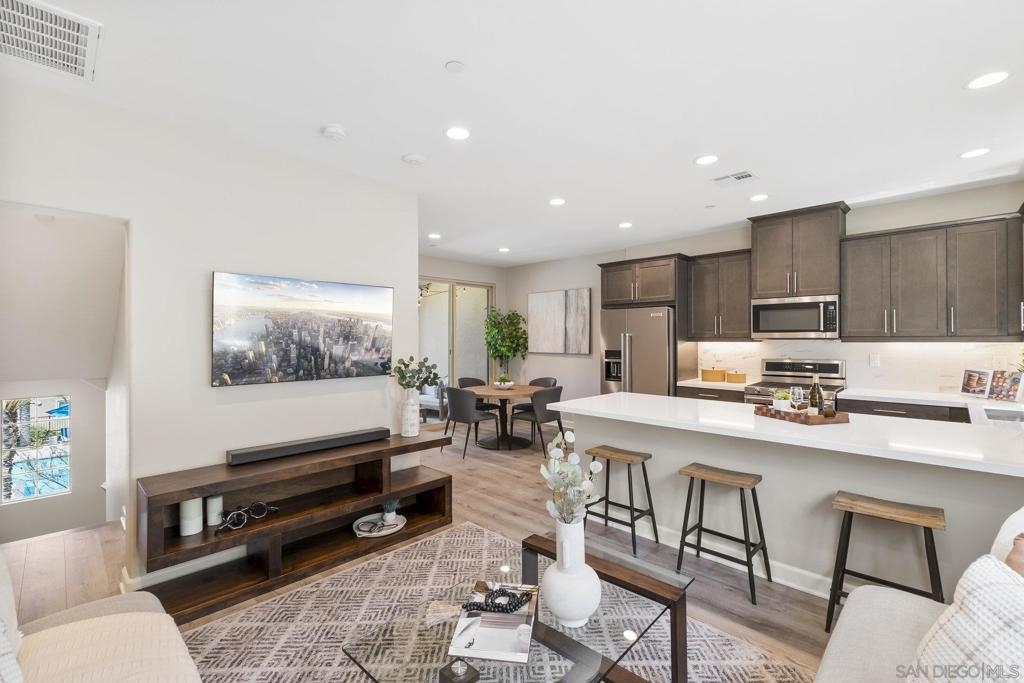 Welcome home to this stunning property in picturesque Latitude at Rancho Tesoro! Set against the scenic hills, this gated community with resort-style amenities, including a pool, BBQs, loungers and more, offers an incredible lifestyle and is situated within the boundaries of sought-after Double Peak School. Built in 2021 and featuring owned solar, this pristine townhome boasts a premium lot with views of the pool and surrounding hills. Beautifully-maintained and upgraded throughout, this 2 bedroom, 2.5 bathroom, 1336 ESF smart home with fiber connectivity lives large with a fantastic open floor plan. Upon entering, you’re greeted by a welcoming foyer with storage and entry to the 2-car garage with EV charger. Continuing upstairs, the main living floor offers plentiful natural light and is perfect for entertaining with the living, dining, and kitchen areas all leading out to a large covered balcony with a quintessential San Diego palm tree view. The upgraded kitchen, with its expansive counter space and pantry, is the heart of the home — perfect for effortless living and enjoyment. Offering versatility, both bedrooms have attached bathrooms, and laundry with storage is upstairs as well. The primary suite features an upgraded bathroom with walk-in closet and dual vanity. Conveniently located close to trails, shops and restaurants, this home offers a sensational lifestyle that takes full advantage of the indoor-outdoor living available in Rancho Tesoro. From the immaculate interior to the neighborhood amenities, come see for yourself how amazing life could be on Blackstone Dr.