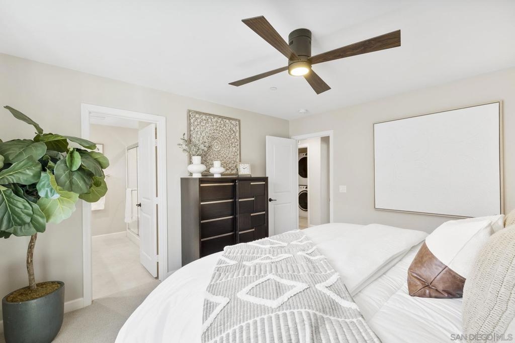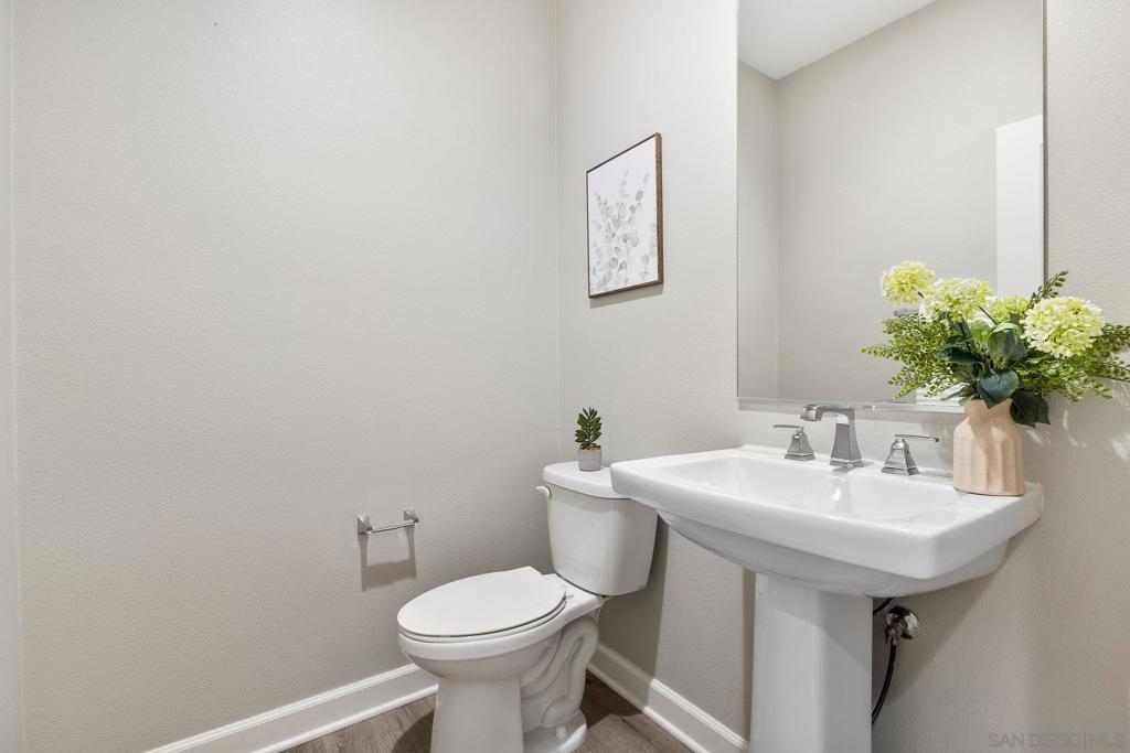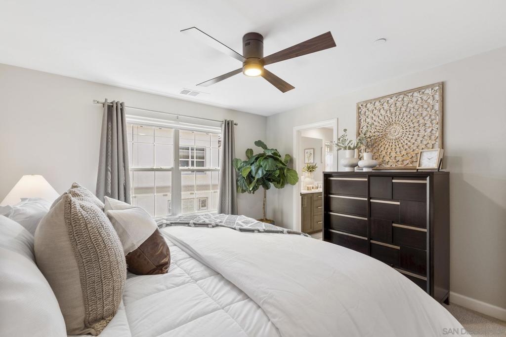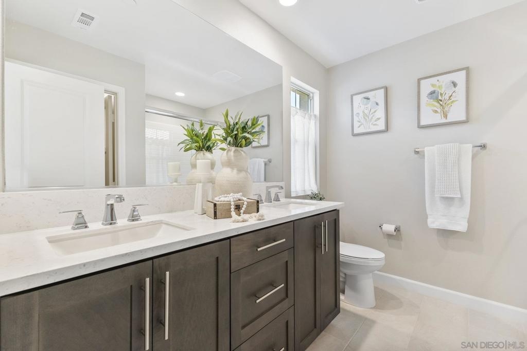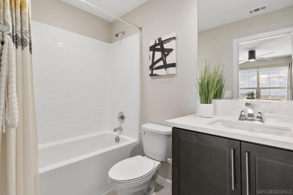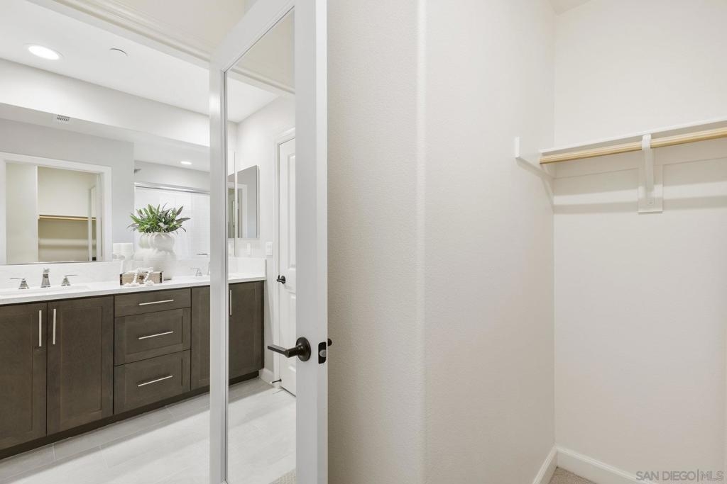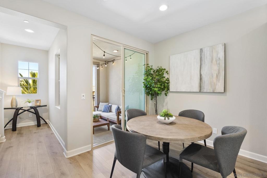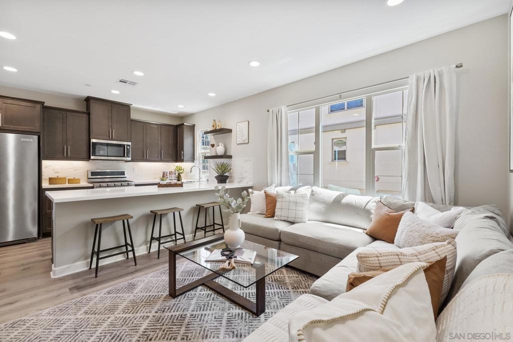 Welcome home to this stunning property in picturesque Latitude at Rancho Tesoro! Set against the scenic hills, this gated community with resort-style amenities, including a pool, BBQs, loungers and more, offers an incredible lifestyle and is situated within the boundaries of sought-after Double Peak School. Built in 2021 and featuring owned solar, this pristine townhome boasts a premium lot with views of the pool and surrounding hills. Beautifully-maintained and upgraded throughout, this 2 bedroom, 2.5 bathroom, 1336 ESF smart home with fiber connectivity lives large with a fantastic open floor plan. Upon entering, you’re greeted by a welcoming foyer with storage and entry to the 2-car garage with EV charger. Continuing upstairs, the main living floor offers plentiful natural light and is perfect for entertaining with the living, dining, and kitchen areas all leading out to a large covered balcony with a quintessential San Diego palm tree view. The upgraded kitchen, with its expansive counter space and pantry, is the heart of the home — perfect for effortless living and enjoyment. Offering versatility, both bedrooms have attached bathrooms, and laundry with storage is upstairs as well. The primary suite features an upgraded bathroom with walk-in closet and dual vanity. Conveniently located close to trails, shops and restaurants, this home offers a sensational lifestyle that takes full advantage of the indoor-outdoor living available in Rancho Tesoro. From the immaculate interior to the neighborhood amenities, come see for yourself how amazing life could be on Blackstone Dr.
